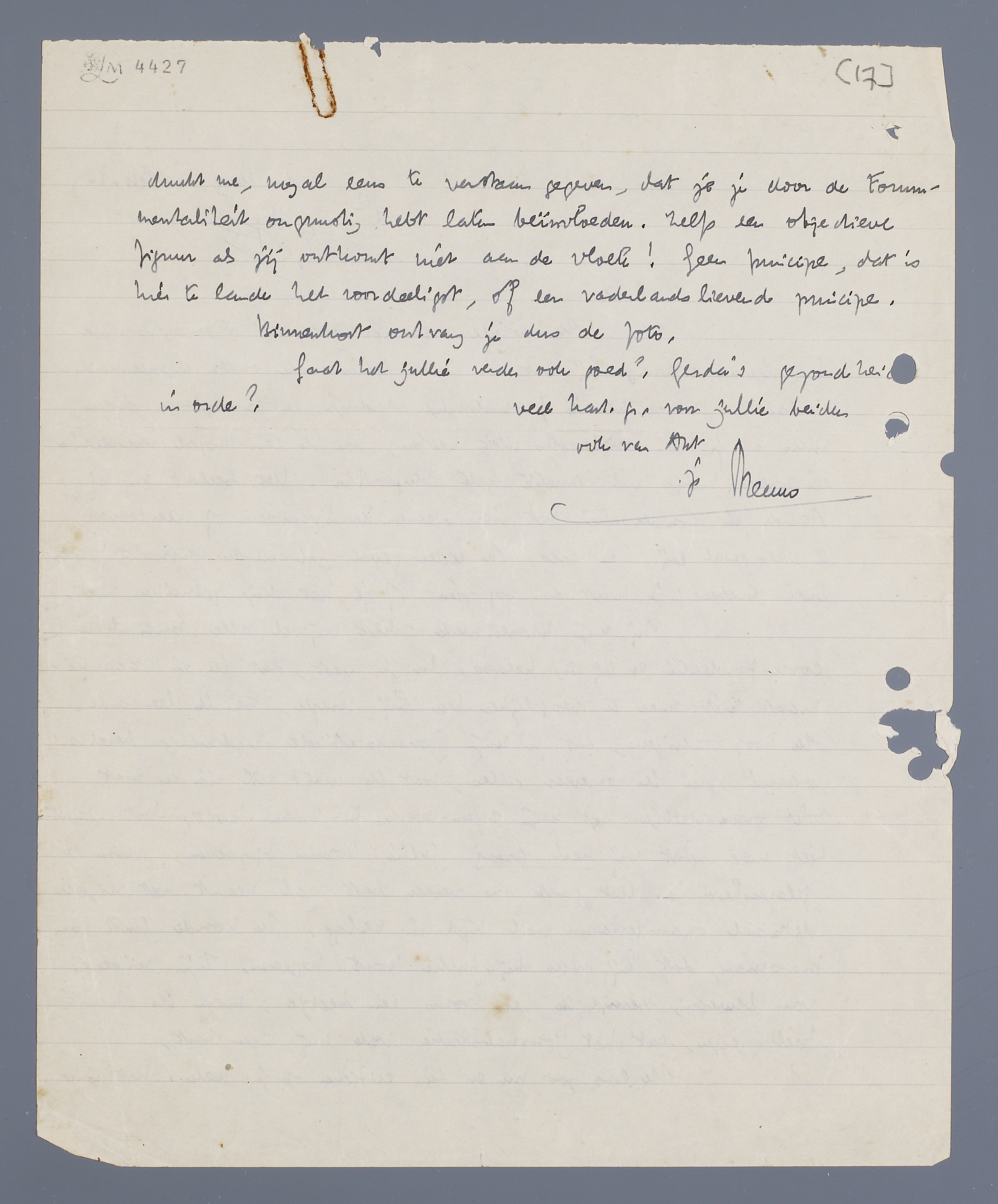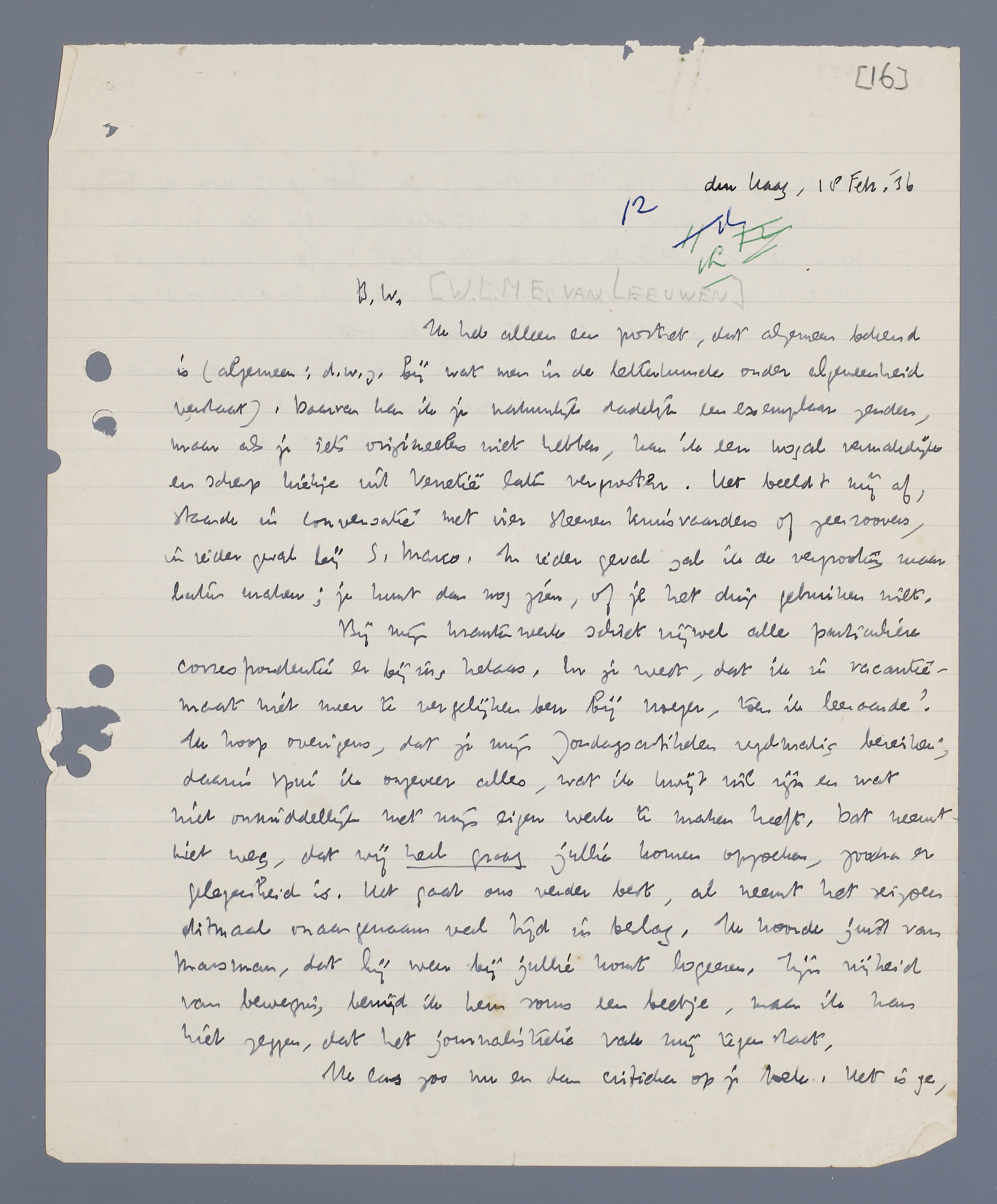 Bij mijn krantenwerk schiet vrijwel alle particuliere correspondentie er bij in, helaas. En je weet, dat ik in vacantiemaat niet meer te vergelijken ben bij vroeger, toen ik leeraarde? Ik hoop overigens, dat je mijn Zondagsartikelen regelmatig bereiken; daarin spui ik ongeveer alles, wat ik kwijt wil zijn en wat niet onmiddellijk met mijn eigen werk te maken heeft. Dat neemt niet weg, dat wijheel graag jullie komen opzoeken, zoodra er gelegenheid is. Het gaat ons verder best, al neemt het seizoen ditmaal onaangenaam veel tijd in beslag. Ik hoorde juist van Marsman, dat hij weer bij jullie komt logeeren. Zijn vrijheid van beweging benijd ik hem soms een beetje, maar ik kan niet zeggen, dat het journalistieke vak mij tegenstaat.