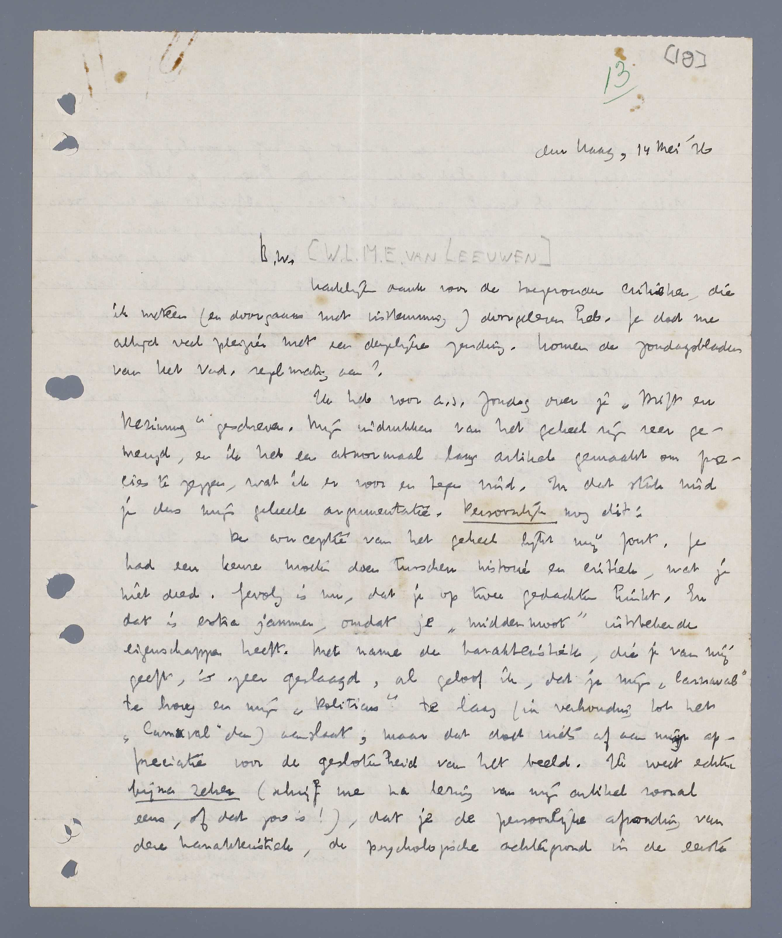 De conceptie van het geheel lijkt mij fout. Je had een keuze moeten doen tusschen historie en critiek, wat je niet deed. Gevolg is nu, dat je op twee gedachten hinkt. En dat is extra jammer, omdat je ‘middennoot’ uitstekende eigenschappen heeft. Met name de karakteristiek, die je van mij geeft, is zeer geslaagd, al geloof ik, dat je mijn ‘Carnaval’ te hoog en mijn ‘Politicus’ te laag (in verhouding tot het ‘Carnaval’) aanslaat, maar dat doet niets af aan mijn appreciatie voor de geslotenheid van het beeld. Ik weet echter bijna zeker (schrijf me na lezing van mijn artikel vooral eens, of dat zoo is!), dat je de persoonlijke afronding van deze karakteristiek, de psychologische achtergrond in de eerste plaats ook zoo hebt kunnen geven, omdat je mij persoonlijk kent en mijn werken dus kunt relativeeren door mijn leven. Je hebt belangstelling in mij als mensch, en dat komt de qualificatie van mijn boeken ten goede. Ook bij Vestdijk, Du Perron en andere ‘verwanten’ is je instelling m.i. zeer zuiver; Anthonie Donker is ook zeer goed. Maar wat je dan weer over Jany zegt, lijkt mij precies het tegenovergestelde. Je instelling op den mensch is daar geheel verdrongen door onverantwoordelijke hymnen, die dus volstrekt niet kloppen met de andere (beste) stukken van je boek, en dan is je volledigheidsmanie de ergste handicap, vind ik. Hier verval je weer in objectiviteitsdrift die in je andere boeken natuurlijk geheel op zijn plaats is, maar hier beslist veel bedorven heeft.
