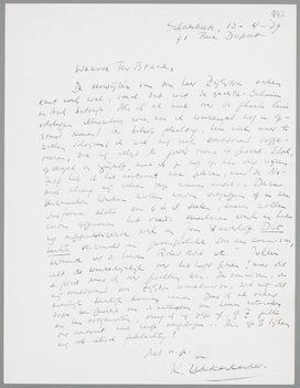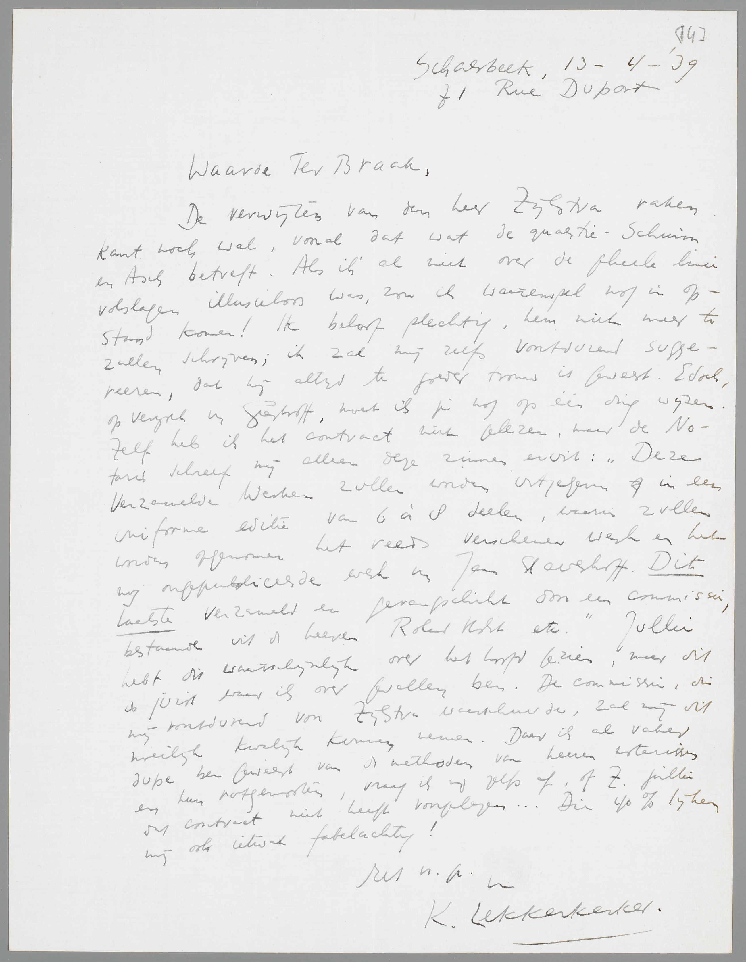 De verwijten van den heer Zijlstra raken kant noch wal, vooral dat wat de quaestie Schuim en Asch betreft. Als ik al niet over de geheele linie volslagen illusieloos was, zou ik waarempel nog in opstand komen! Ik beloof plechtig hem niet meer te zullen schrijven; ik zal mij zelfs voortdurend suggereeren, dat hij altijd te goeder trouw is geweest. Edoch, op verzoek van Greshoff moet ik je nog op één ding wijzen. Zelf heb ik het contract niet gelezen, maar de Notaris schreef mij alleen deze zinnen eruit: ‘Deze Verzamelde Werken zullen worden uitgegeven in en uniforme editie an 6 à 8 deelen, waarin zullen worden opgenomen het reeds verschenen werk en het nog ongepubliceerde werk van Jan Slauerhoff. Dit laatste verzameld en gerangschikt door een commissie bestaande uit 8 heeren Roland Holst etc.’ Jullie hebt dit waarschijnlijk over het hoofd gezien, maar dit is juist waar ik over gevallen ben. De commissie, die mij voortdurend voor Zijlstra waarschuwde, zal mij dit moeilijk kwalijk kunnen nemen. Daar ik al vaker dupe ben geweest van de methoden van heeren notarissen en hun rotgenooten, vraag ik mij zelfs af, of Z. jullie dat contract niet heeft voorgelezen... Die 40% lijken mij ook ietwat fabelachtig.