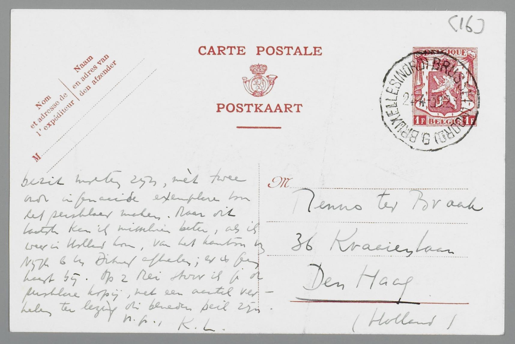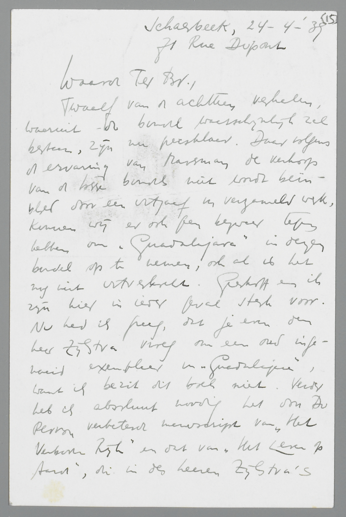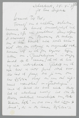 Twaalf van de achttien verhalen, waaruit de bundel waarschijnlijk zal bestaan, zijn nu persklaar. Daar volgens de ervaring van Marsman de verkoop van de losse bundels niet wordt beïnvloed door een uitgaaf in verzameld werk, kunnen wij er ook geen bezwaar tegen hebben om ‘Guadalajara’ in dezen bundel op te nemen, ook al is het nog niet uitverkocht. Greshoff en ik zijn hier in ieder geval sterk voor. Nu had ik graag, dat je even den heer Zijlstra vroeg om een oud ingenaaid exemplaar van ‘Gualadajara’, want ik bezit dit boek niet. Verder heb ik absoluut noodig het door Du Perron verbeterd manuscript van ‘Het Verboden Rijk’ en dat van ‘Het Leven op Aard’, die in des heeren Zijlstra's bezit moeten zijn, mèt twee [woord onleesbaar] ingenaaide exemplaren voor het persklaar maken. Maar dit laatste kan ik misschien beter, als ik weer in Holland kom, van het kantoor van Nijgh & van Ditmar afhalen; er is geen haast bij. Op 2 Mei stuur ik je de persklare kopij, met een aantal verhalen ter lezing die beneden peil zijn.