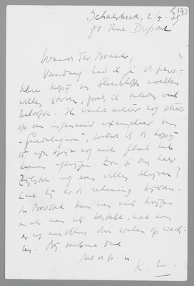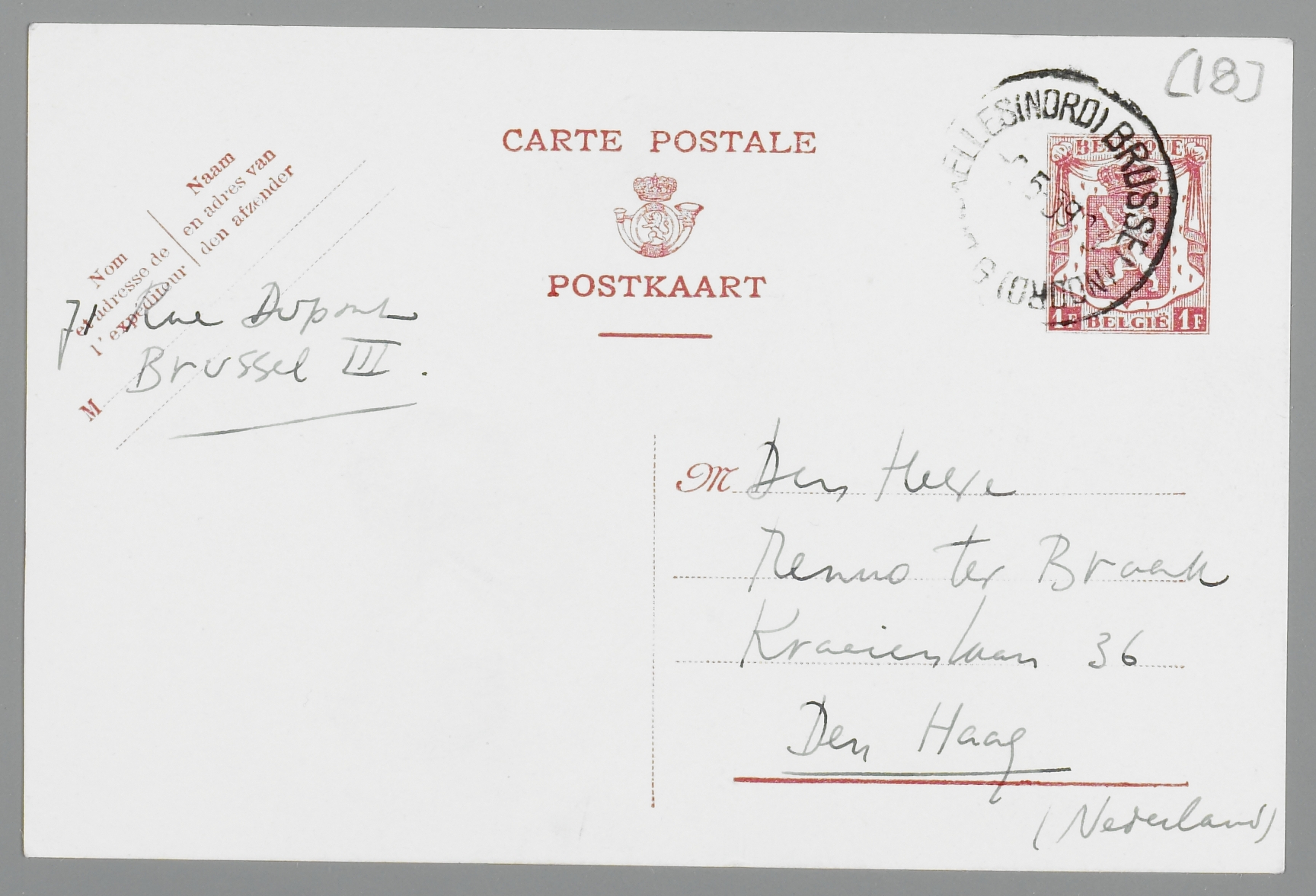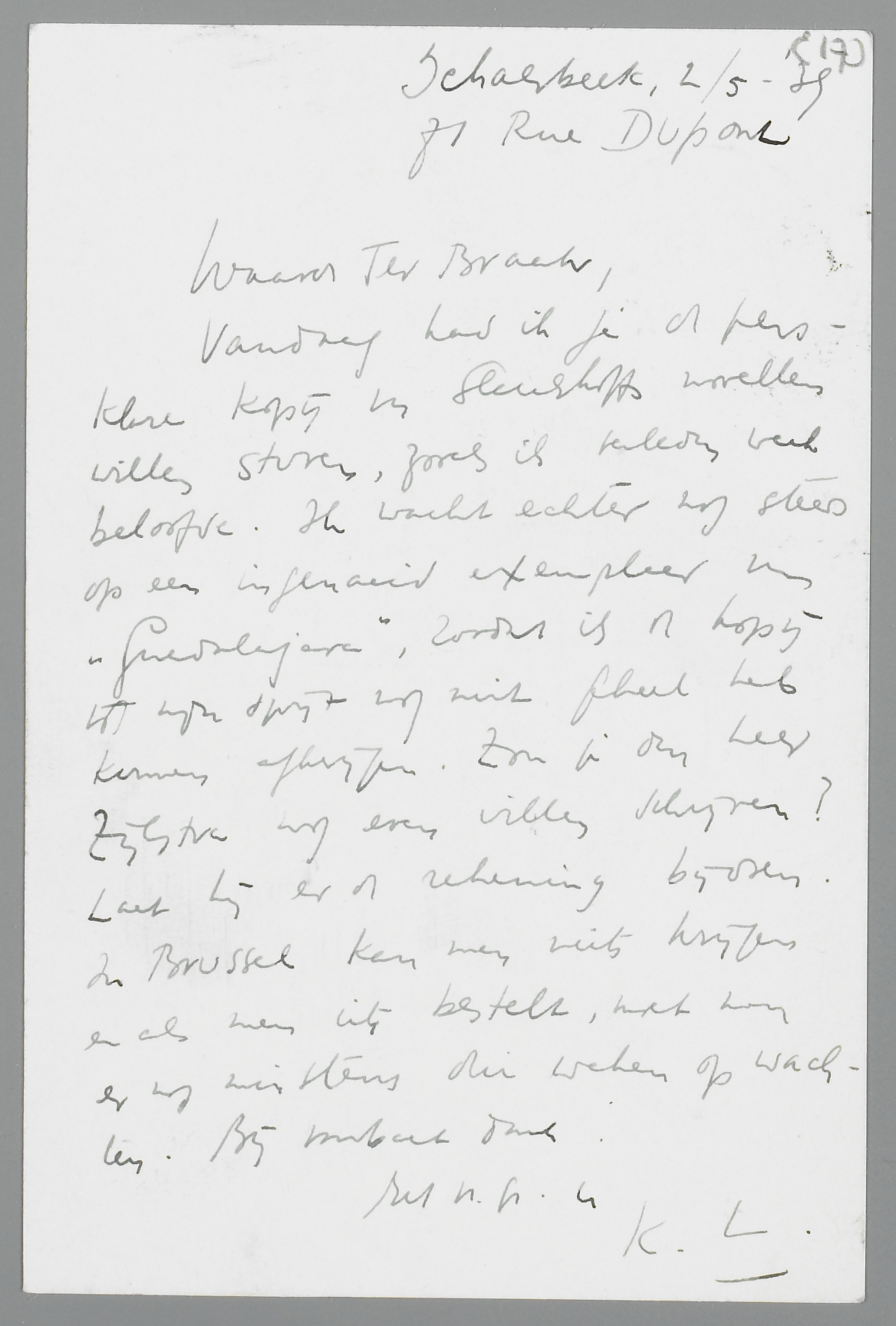 Vandaag had ik je de persklare kopij van Slauerhoffs novellen willen sturen, zooals ik je verleden week beloofde. Ik wacht echter nog steeds op een ingenaaid exemplaar van ‘Guadalajara’, zoodat ik de kopij tot mijn spijt nog niet geheel heb kunnen afkrijgen. Zou je den heer Zijlstra nog even willen schrijven? Laat hij er de rekening bijdoen. In Brussel kan men niets krijgen en als men iets bestelt, moet men er nog minstens drie weken op wachten. Bij voorbaat dank.