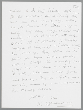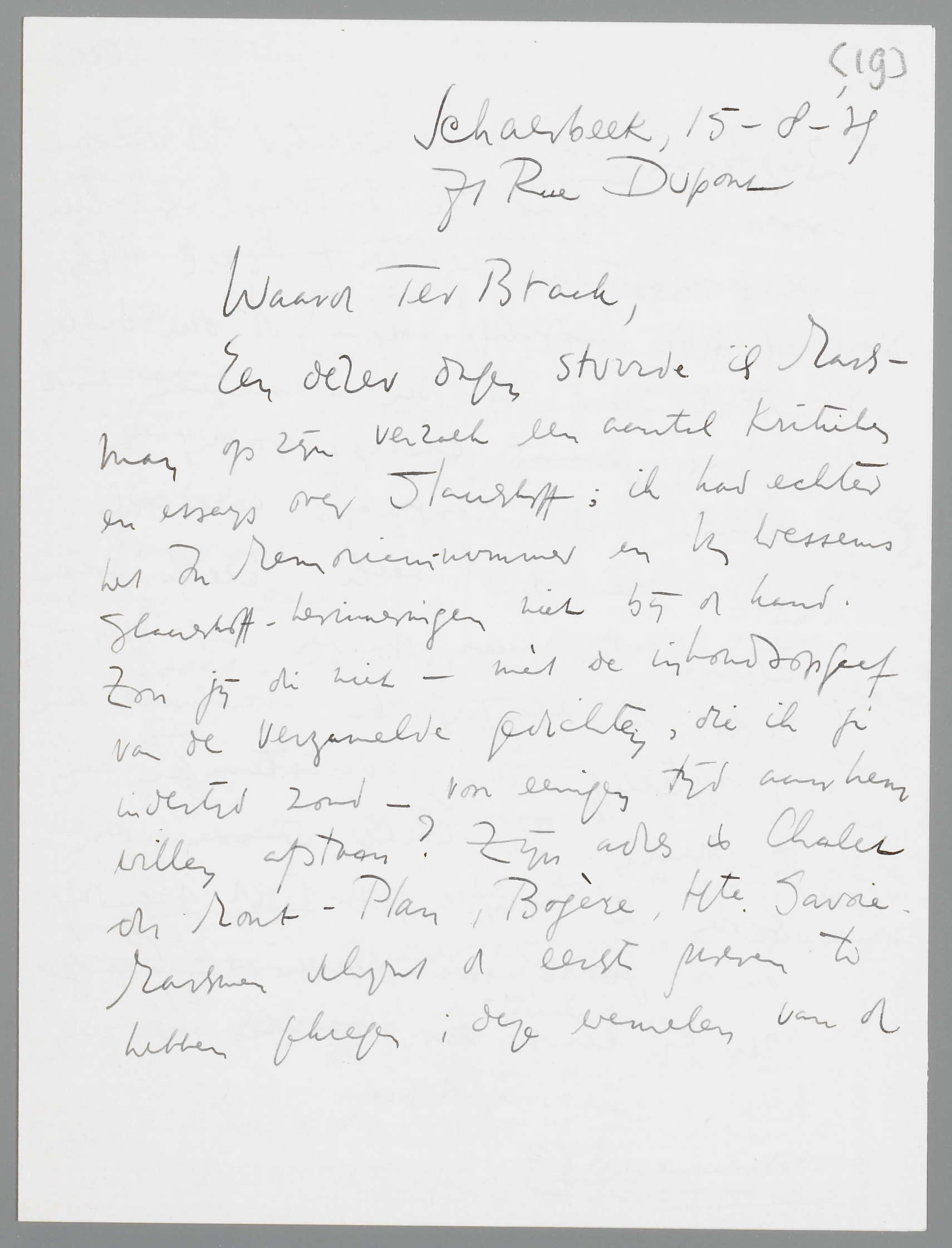 Een dezer dagen stuurde ik Marsman op zijn verzoek een aantal kritieken en essays over Slauerhoff; ik had echter het In Memoriam-nummer en Van Wessems Slauerhoff-herinneringen niet bij de hand. Zou jij die niet - mèt de inhoudsopgaaf van de verzamelde gedichten die ik je indertijd zond - voor eenigen tijd aan hem willen afstaan? Zijn adres is Chalet de Mont-Plan, Bogève, Hte Savoie. Marsman schijnt de eerste proeven te hebben gekregen; deze wemelen van de zetfouten; hij vroeg indertijd de schoone proeven. Tot nog toe ontving ik alleen de proeven van het eerste deel. Als het in de bedoeling ligt, de drie deelen nog dit jaar te doen verschijnen, moet er wel haast gemaakt worden, in verband met Marsmans inleiding. Liever had ik de heele gezette poëzie tegelijk in huis, om een goed overzicht te krijgen en eventueel aan de opstelling eenige verbeteringen aan te brengen. Ik wacht daarom, om kosten te vermijden, met de opzending van de gecorrigeerde proeven. Greshoff zei mij eens, dat Vasalis met een cahier in de Vrije Bladen uitkwam. Als dit inderdaad zoo is, zou ik dan niet één vers hieruit mogen hebben voor ‘In Aanbouw’? Deze verzameling mag alleen ongepubliceerd werk bevatten en als de redactie met het cahier tot 15 November (1 November verschijnt de almanak) zou willen wachten, kan, dunkt mij, tegen afstaan van een gedicht geen bezwaar bestaan. Vasalis heeft mij indertijd alle medewerking toegezegd, maar zij schijnt in Amerika te zitten, ik kan haar in ieder geval niet bereiken. Het zou ontzettend jammer zijn, wanneer zij in zoo'n representatieve verzameling ontbrak.