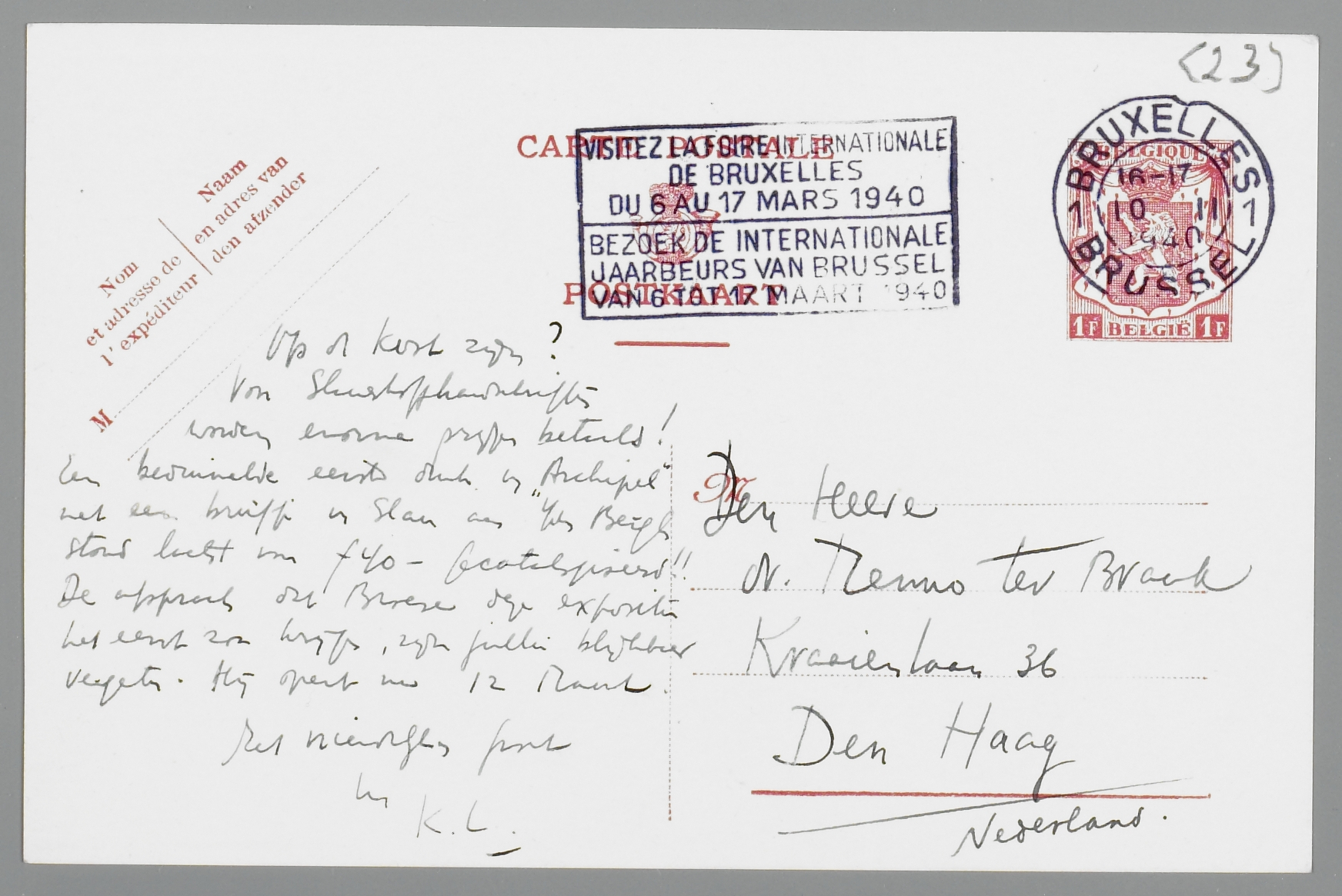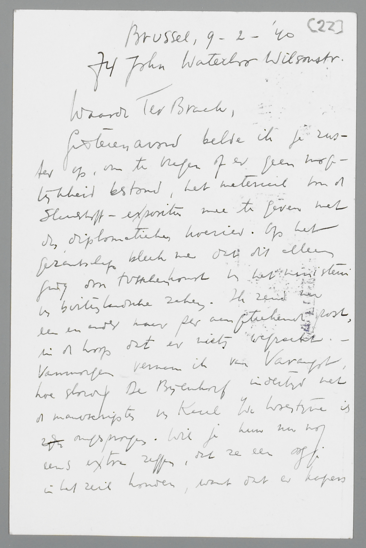 Gisterenavond belde ik je zuster op, om te vragen of er geen mogelijkheid bestond, het materiaal voor de Slauerhoff-expositie mee te geven met den diplomatieken koerier. Op het gezantschap bleek me dat dit alleen ging door tusschenkomst van het ministerie van buitenlandsche zaken. Ik zend nu een en ander maar per aangeteekende post, in de hoop dat er niets wegraakt. Vanmorgen vernam ik van Varangot, hoe slordig De Bijenkorf indertijd met de manuscripten van Karel van de Woestijne is omgesprongen. Wil je hun nu nog eens extra zeggen, dat ze een oogje in het zeil houden, want dat er kapers op de kust zijn? Voor Slauerhoff-handschriften worden enorme prijzen betaald! Een beduimelde eerste druk van ‘Archipel’ met een briefje van Slau aan Van den Bergh stond laatst voor f 40,- gecatalogiseerd! De afspraak dat Broese deze expositie het eerst zou krijgen, zijn jullie blijkbaar vergeten. Hij opent nu 12 Maart.