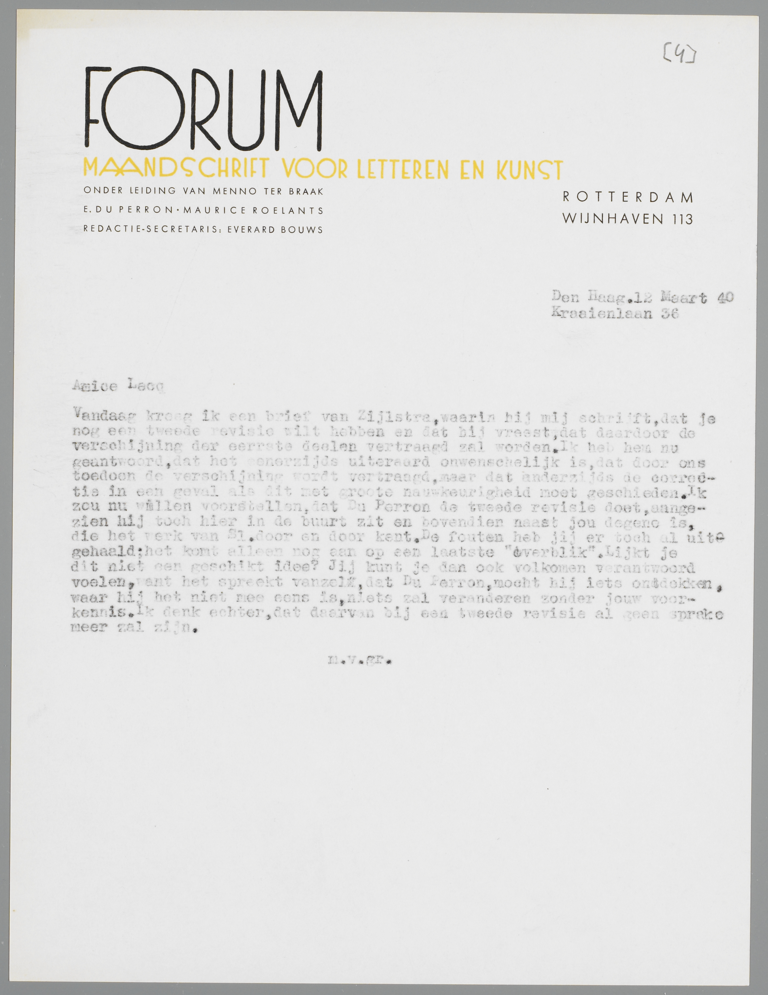 Vandaag kreeg ik een brief van Zijlstra, waarin hij mij schrijft, dat je nog een tweede revisie wilt hebben en dat hij vreest, dat daardoor de verschijning der eerste deelen vertraagd zal worden. Ik heb hem nu geantwoord, dat het enerzijds uiteraard onwenschelijk is, dat door ons toedoen de verschijning wordt vertraagd, maar dat anderzijds de correctie in een geval als dit met groote nauwkeurigheid moet geschieden. Ik zou nu willen voorstellen, dat Du Perron de tweede revisie doet, aangezien hij toch hier in de buurt zit en bovendien naast jou degene is, die het werk van Sl. door en door kent. De fouten heb jij er toch al uitgehaald; het komt alleen nog aan op een laatste ‘overblik’. Lijkt je dit niet een geschikt idee? Jij kunt je dan ook volkomen verantwoord voelen, want het spreekt vanzelf, dat Du Perron, mocht hij iets ontdekken, waar hij het niet mee eens is, niets zal veranderen zonder jouw voorkennis. Ik denk echter, dat daarvan bij een tweede revisie al geen sprake meer zal zijn.