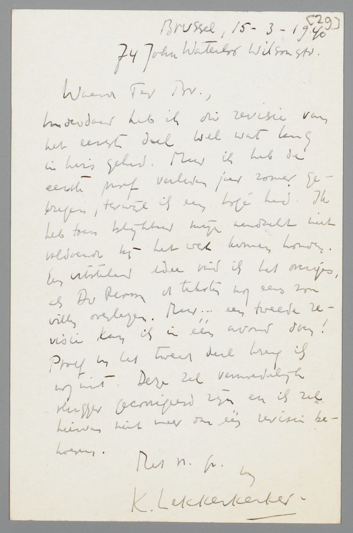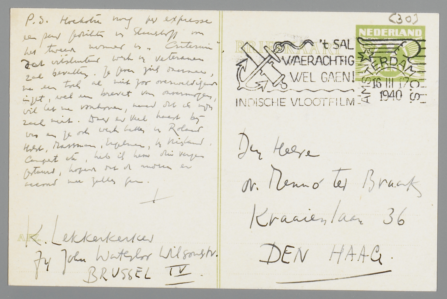 P.S. Hoekstra vroeg per expresse een paar gedichten van Slauerhoff voor het tweede nummer van ‘Criterium’, dat uitsluitend werk van veteranen zal bevatten. Ze geven zich daarmee, na een toch al niet zoo overweldigende inzet, wel een brevet van onvermogen, wil het me voorkomen, maar dat is mijn zaak niet. Daar er veel haast bij was en ze ook werk hebben van Roland Holst, Marsman, Engelman, Van Vriesland, Campert etc., heb ik hem die verzen gestuurd, hopend dat de anderen er accoord mee zullen gaan.