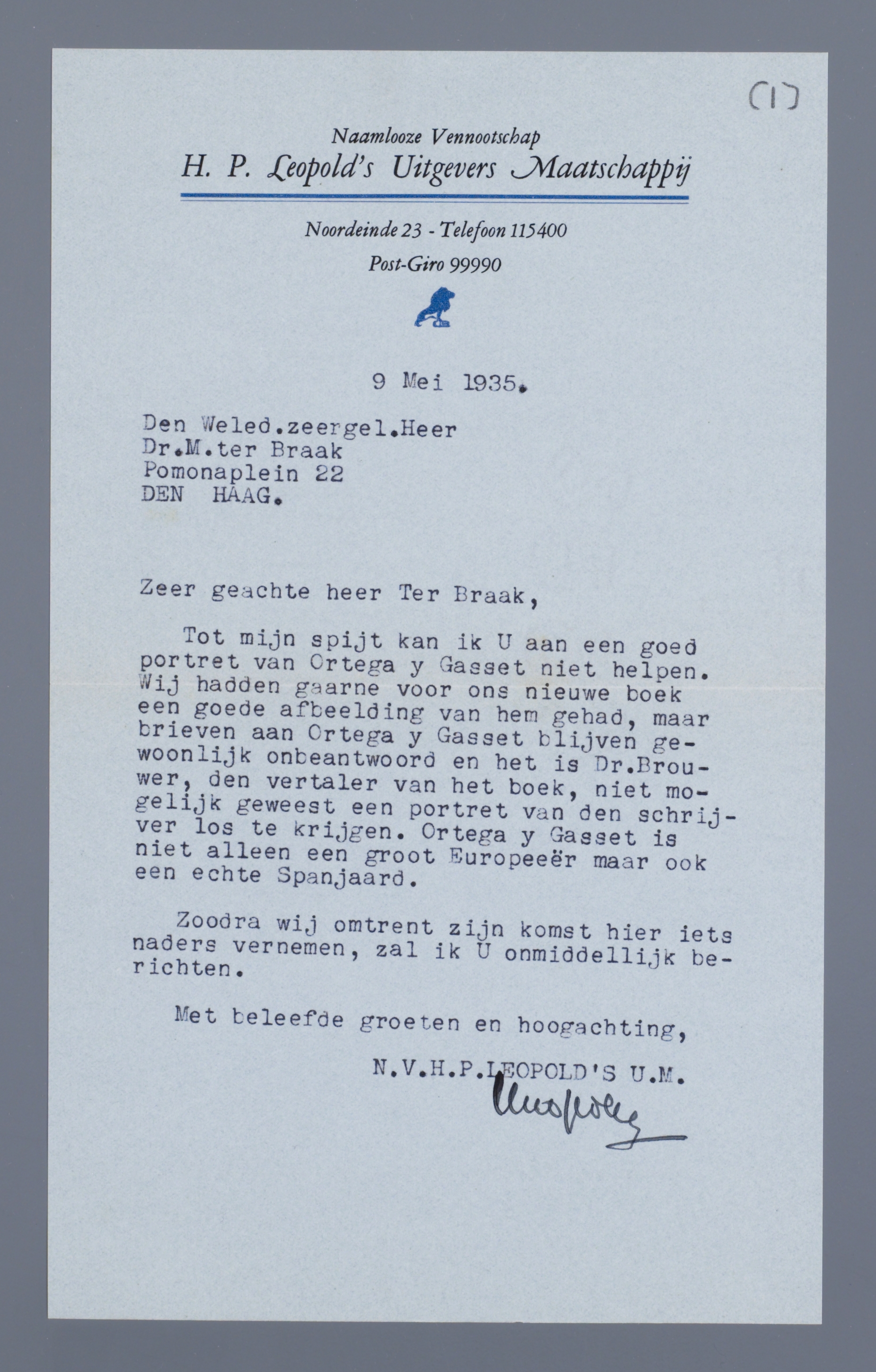 Tot mijn spijt kan ik U aan een goed portret van Ortega y Gasset niet helpen. Wij hadden gaarne voor ons nieuwe boek een goede afbeelding van hem gehad, maar brieven aan Ortega y Gasset blijven gewoonlijk onbeantwoord en het is Dr. Brouwer, den vertaler van het boek, niet mogelijk geweest een portret van den schrijver los te krijgen. Ortega y Gasset is niet alleen een groot Europeeër, maar ook een echte Spanjaard.