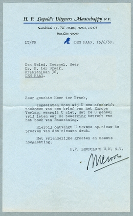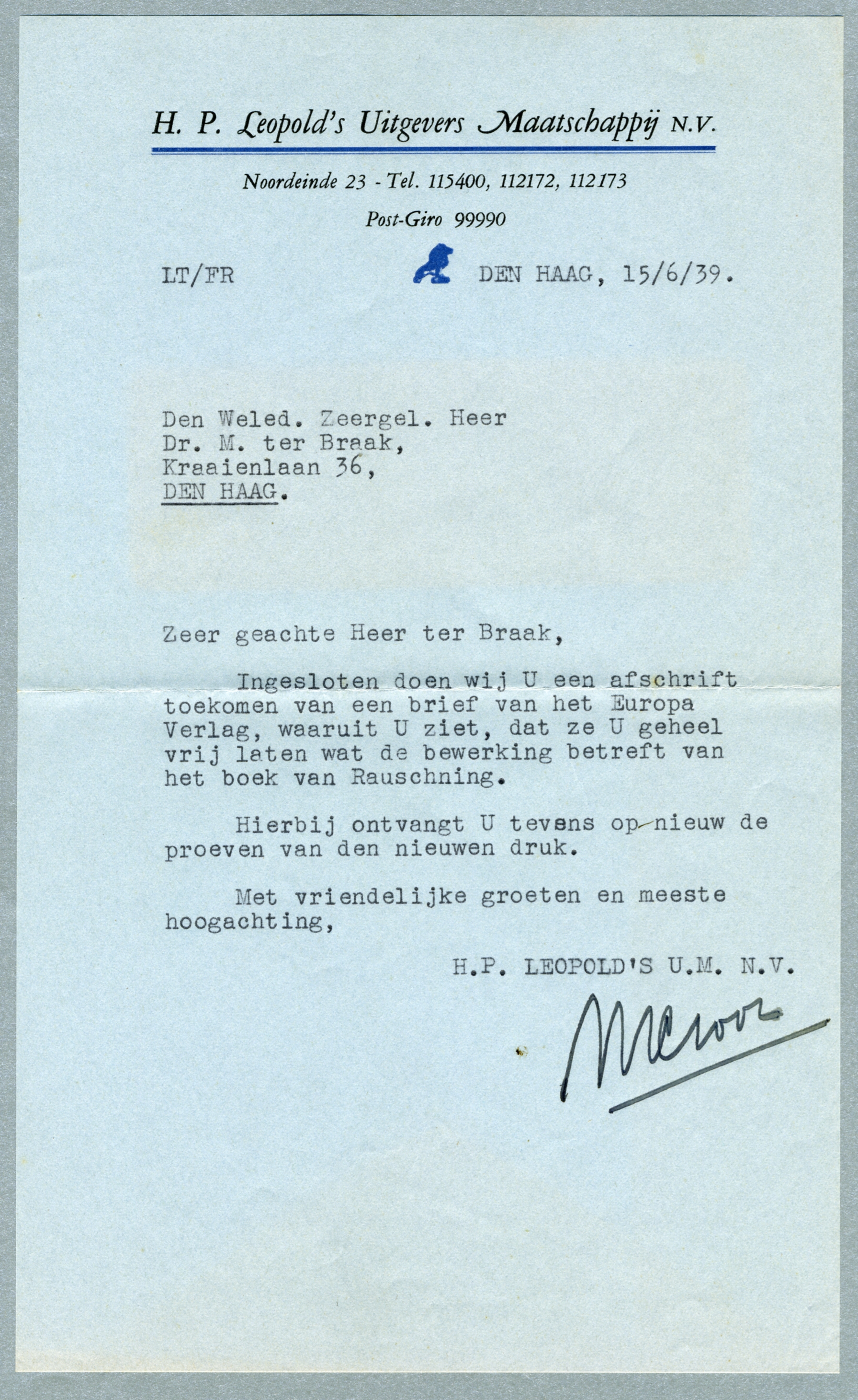 Ingesloten doen wij U een afschrift toekomen van een brief van het Europa Verlag, waaruit U ziet, dat ze U geheel vrij laten wat de bewerking van het boek van Rauschning.