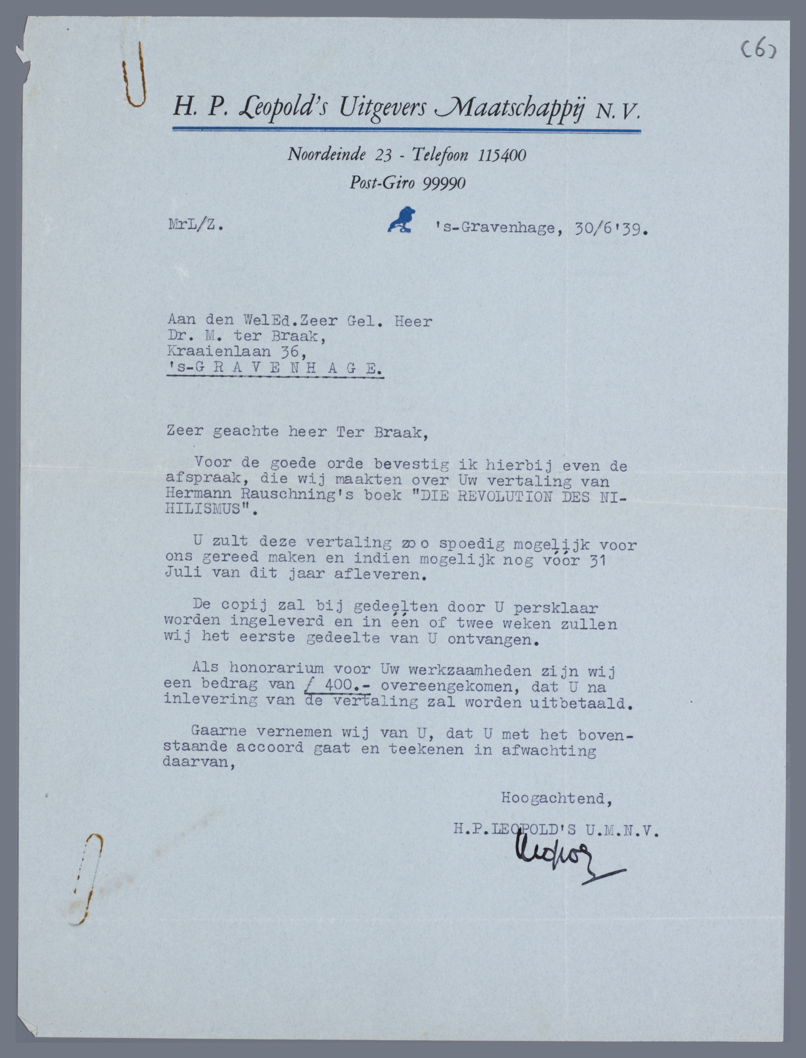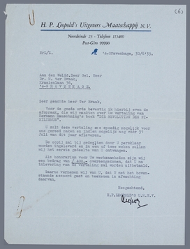 Voor de goede orde bevestig ik hierbij even de afspraak, die wij maakten over de vertaling van Herman Rauschning's boek ‘DIE REVOLUTION DES NIHILISMUS’.