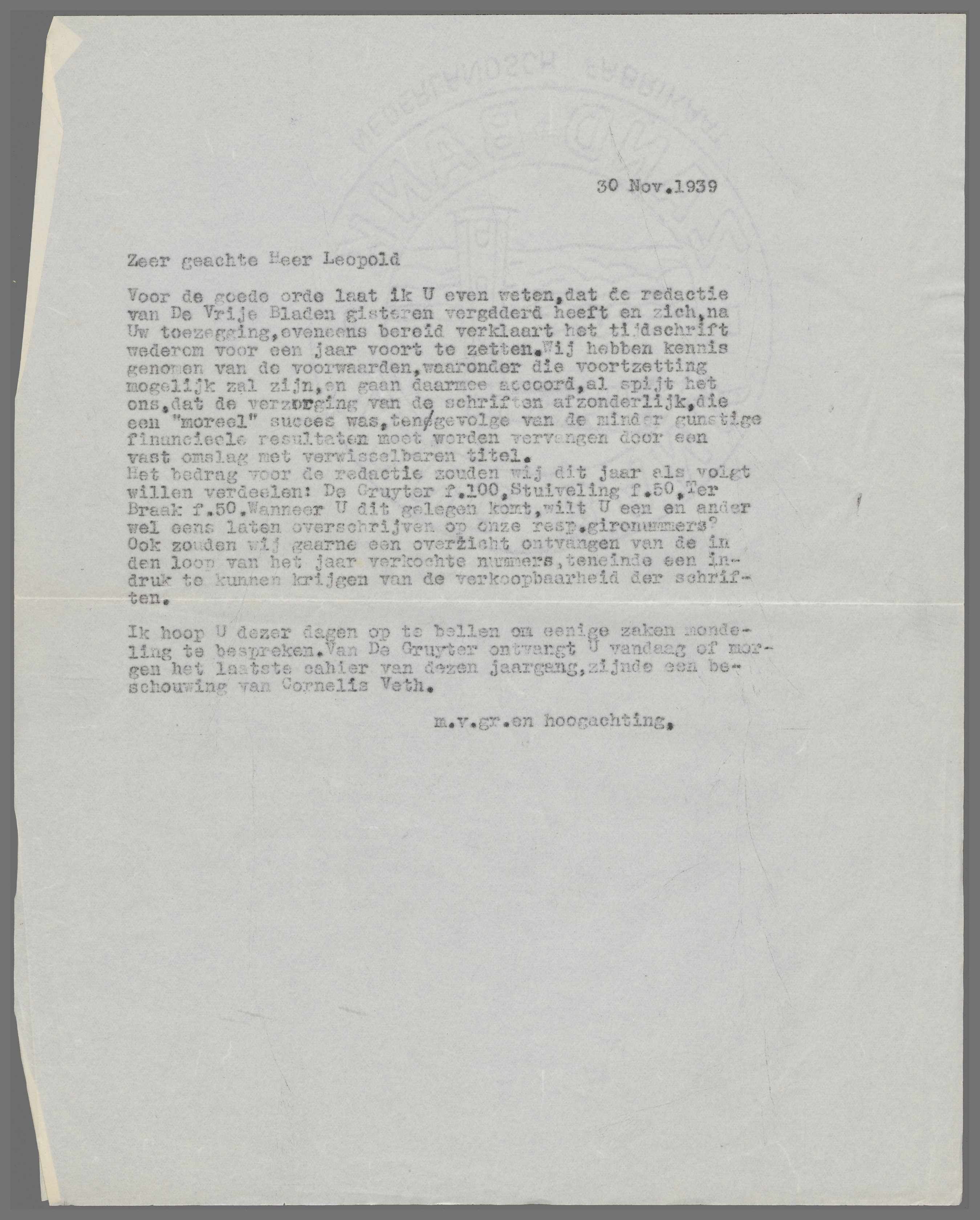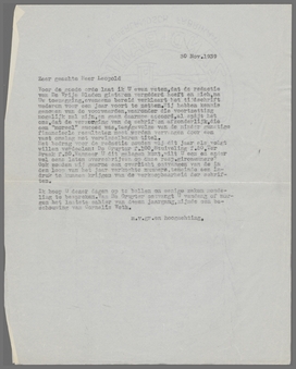 Voor de goede orde laat ik U even weten, dat de redactie van Vrije Bladen gisteren vergaderd heeft en zich, na Uw toezegging, eveneens bereid verklaart het tijdschrift wederom voor een jaar voort te zetten. Wij hebben kennis genomen van de voorwaarden, waaronder die voortzetting mogelijk zal zijn, en gaan daarmee accoord, al spijt het ons, dat de verzorging van de schriften afzonderlijk, die een ‘moreel’ succes was, ten gevolge van de minder gunstige financieele resultaten moet worden vervangen door een vast omslag met verwisselbaren titel.