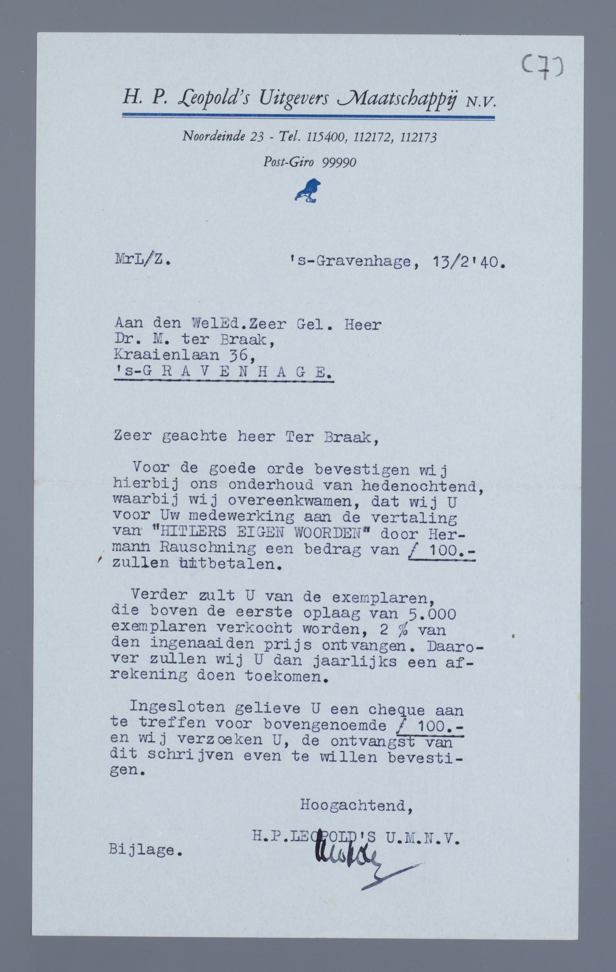 Voor de goede orde bevestigen wij hierbij ons onderhoud van hedenochtend, waarbij wij overeen kwamen, dat wij U voor Uw medewerking aan de vertaling van ‘HITLERS EIGEN WOORDEN’ door Herman Rauschning een bedrag van f 100.- zullen uitbetalen.