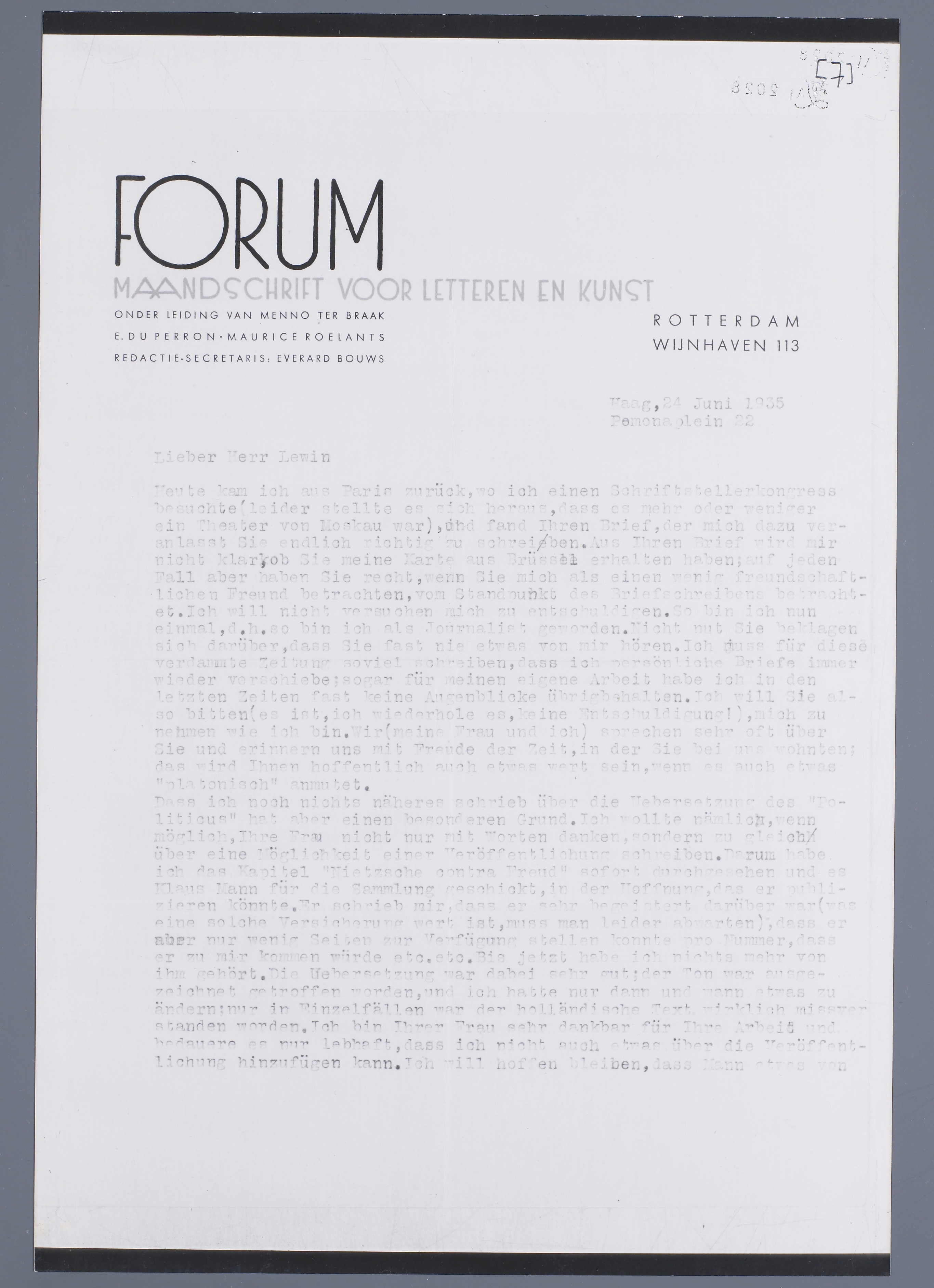 Dass ich noch nichts näheres schrieb über die Uebersetzung des ‘Politicus’ hat aber einen besonderen Grund. Ich wollte nämlich, wenn möglich, Ihre Frau nicht nur mit Worten danken, sondern zu gleich über eine Möglichkeit einer Veröffentlichung schreiben. Darum habe ich das Kapitel ‘Nietzsche contra Freud’ sofort durchgesehen und es Klaus Mann für die Sammlung geschickt, in der Hoffnung das er publizieren könnte. Er schrieb mir dass er sehr begeistert darüber war (was eine solche Versicherung wert ist, muss man leider abwarten), dass er aber nur wenig Seiten zur Verfügung stellen konnte pro Nummer, dass er zu mir kommen wurde etc.etc. Bis jetzt habe ich nichts mehr von ihm gehört. Die Uebersetzung war dabei sehr gut: der Ton war ausgezeicnet getroffen worden, und ich hätte nur dann und wann etwas zu ändern: nur in Einzelfällen war der holländische Wort wirklich misverstanden worden. Ich bin Ihrer Frau sehr dankbar für Ihre Arbeit und bedauere es nur lebhaft, dass ich nicht auch etwas über die Veröffentlichung hinzufügen kann. Ich will hoffen bleiben, dass Mann etwas von sich hören lässt. Ein Vorabdruck in der Sammlung könnte man ja gut gebrauchen um das ganze Buch zu präsentieren. Ich schreibe wie ein Neger, beachten Sie es bitte nicht, ich bin todmüde von meiner Pariser Reise.