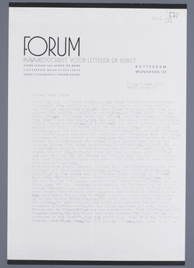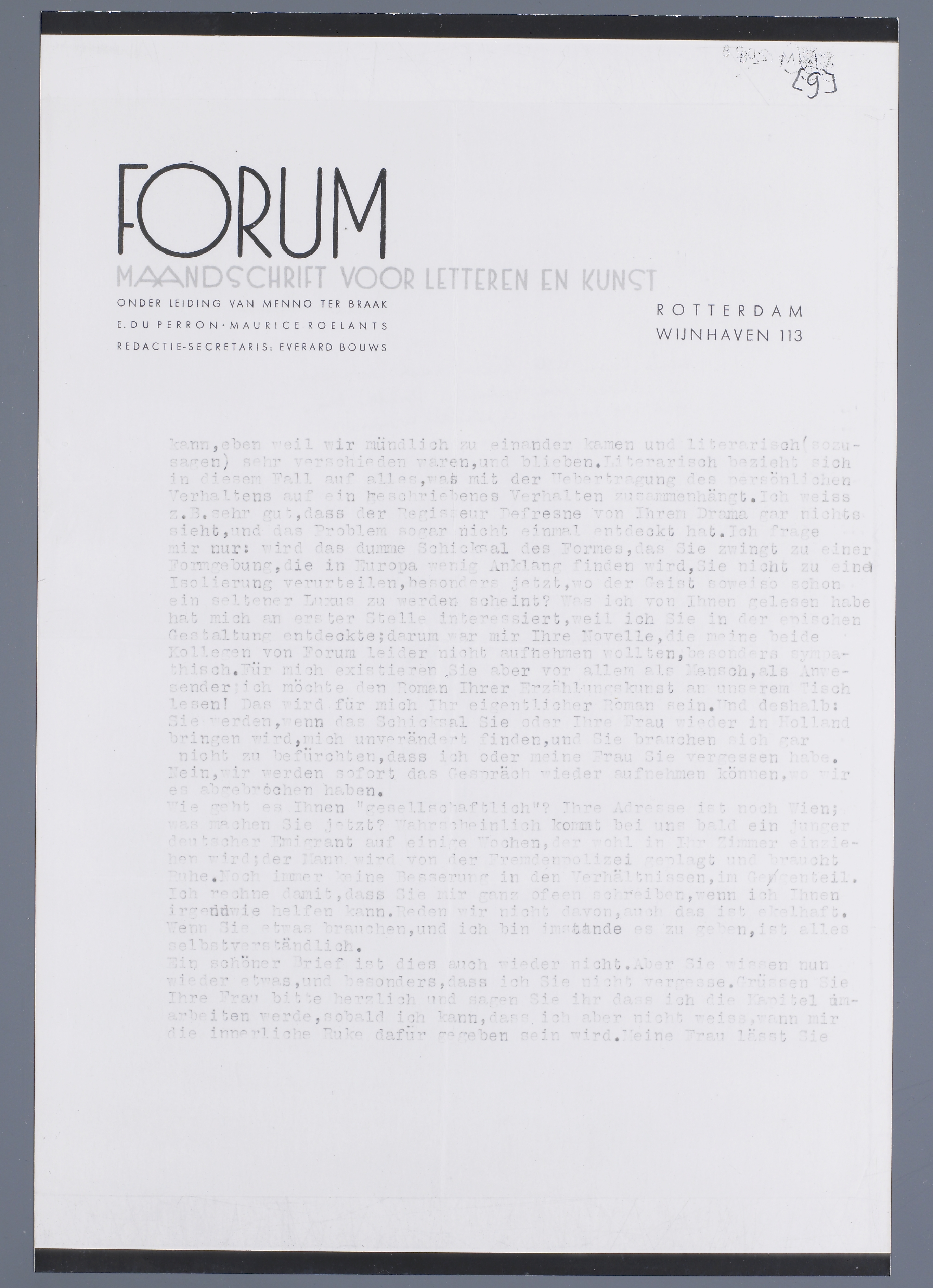 Wir haben damals, als Sie bei uns wohnten, über die gesellschaftliche Hifslosigkeit gesprochen. Sie sehen, ich bin nicht viel besser in dieser Hinsicht wie Sie, ich vertrete Ihre Interessen dilettantisch, ich weiss es und mache mir Vorwurfe. Wenn Sie aber wussten, wie verhasst mir diese ‘Beziehungen’ zu diesem und jenem sind, die man trotz dem den nicht entbehren kann. Es wäre mir lieb mit Ihnen wieder zu sprechen. Unsere beziehungen waren ja andrer Natur. Ich habe das Gefühl dass ich Ihnen über wesentliche Angelegenheiten schwerlich schreiben kann, eben weil wir mündlich zu einander kamen und ‘literarisch’ sozusagen sehr verschieden waren, und blieben. Literarisch bezieht sich in diesem Fall auf alles, was mit der Uebertragung des persönlichen Verhaltens auf ein geschriebenes Verhalten zusammenhängt. Ich weiss z.B. sehr gut, dass der Regisseur Defresne von Ihren drama gar nichts sieht, und das Problem sogar nicht einmal entdeckt hat. Ich frage mir nur: wird das dumme Schicksal des Formes, das Sie zwingt zu einer Formgebung, die in Europa wenig Anklang finden wird, Sie nicht zu eine Isolierung verurteilen, besonders jetzt, wo der Geist sowieso schon ein seltener Luxus zu werden scheint? Was ich von Ihnen gelesen habe hat mich an erster Stelle interessiert, weil ich Sie in der epischen Gestaltung entdeckte; darum war mir Ihre Novelle, die meine beide Kollegen van Forum leider nicht aufnehmen wollten, besonders sympathisch. Für mich existieren Sie aber vor allem als Mensch, als Anwesender; ich möchte den Roman Ihrer Erzählungskunst an unserem Tisch lesen. Das wird für mich Ihr eigentlicher Roman sein. Und deshalb: Sie werden, wenn das Schichsal Sie oder Ihre Frau wieder in Holland bringen wird, mich unverändert finden, und Sie brauchen sich gar nicht zu befürchten, dass ich oder meine Frau Sie vergessen habe. Nein, wir werden sofort das Gespräch wieder aufnehmen können wo wir es abgebrochen haben.