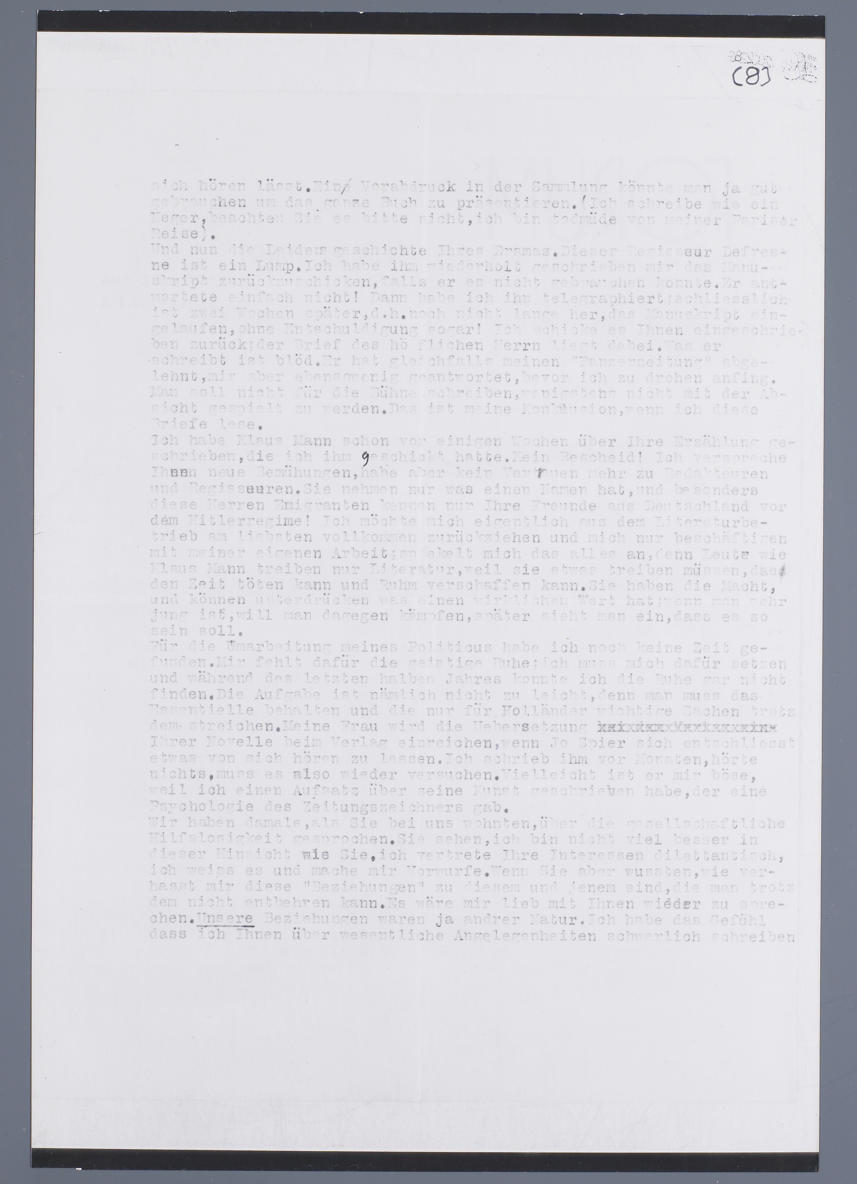 Ich habe Klaus Mann schon vor einigen Wochen über Ihre Erzählung geschrieben, die ich ihm geschickt hatte. Kein Bescheid! Ich verspreche Ihnen neue Bemühungen, habe aber kein Vertrauen mehr zu Redakteuren und Regisseuren. Sie nehmen nur was einen Namen hat, und besonders diesen Herren Emigranten kennen nur Ihre Freunde aus Deutschland vor dem Hitlerregime! Ich möchte mich eigentlich aus dem Literaturbetrieb am liebsten vollkommen zurückziehen und mich nur beschäftigen mit meiner eigenen Arbeit; so ekelt mich das alles an, denn Leute wie Klaus Mann, treiben nur Literatur, weil sie etwas treiben müssen, dass den Zeit töten kann und Ruhm verschaffen kann. Sie haben die Macht, und können unterdrücken was einen wirklichen wert hat: wenn man sehr jung ist, will man dagegen kämpfen, später sieht man ein, dass es so sein soll.