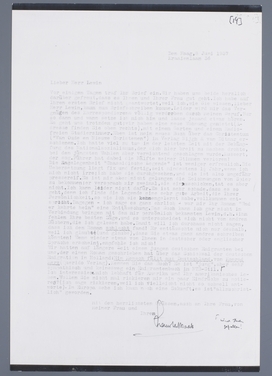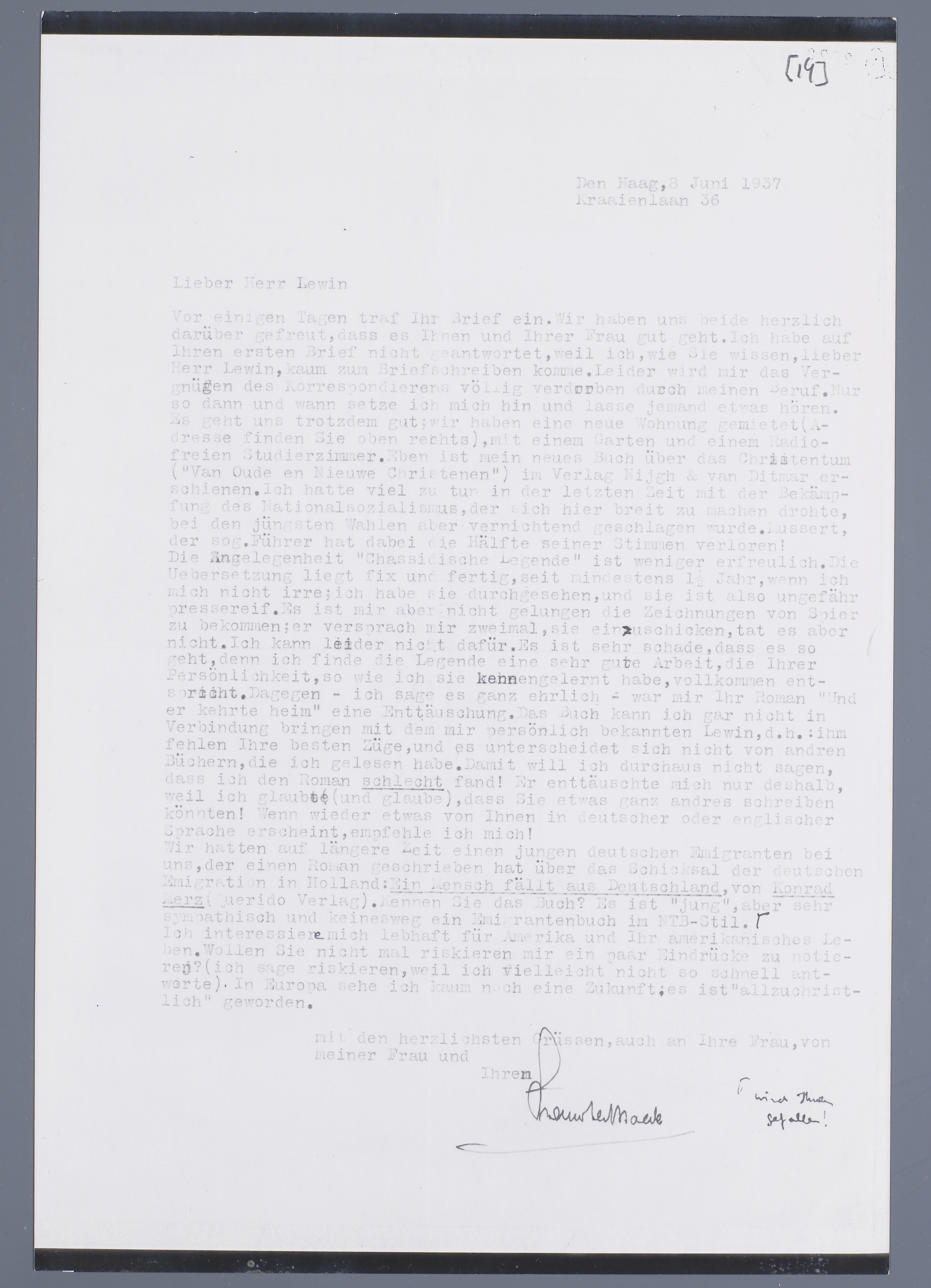 Vor einigen Tagen traf Ihr Brief ein. Wir haben uns beide herzlich darüber gefreut, dass es Ihnen und Ihrer Frau gut geht. Ich habe auf Ihren ersten Brief nicht geantwortet, weil ich, wie Sie wissen, lieber Herr Lewin., kaum zum Briefschreiben komme. Leider wird mir das Vergnügen des Korrespondierens völlig verdorben durch meinen Beruf. Nur so dann und wann setze ich mich hin und lasse jemand etwas hören. Es geht uns trotzdem gut: wir haben eine neue Wohnung gemietet (Adresse finden sie oben rechts), mit einem Garten und einem Radiofreien Studierzimmer. Eben ist mein neues Buch über das Christentum (‘Van oude en nieuwe Christenen’) in Verlag Nijgh & van Ditmar erschienen. Ich hatte viel zu tun in der letzten Zeit mit der Bekämpfung des Nationalsozialismus, der sich hier breit zu machen drohte, bei den jüngsten Wahlen aber vernichtend geschlagen wurde. Mussert, der sog. Führer hat dabei die Hälfte seiner Stimmen verloren!