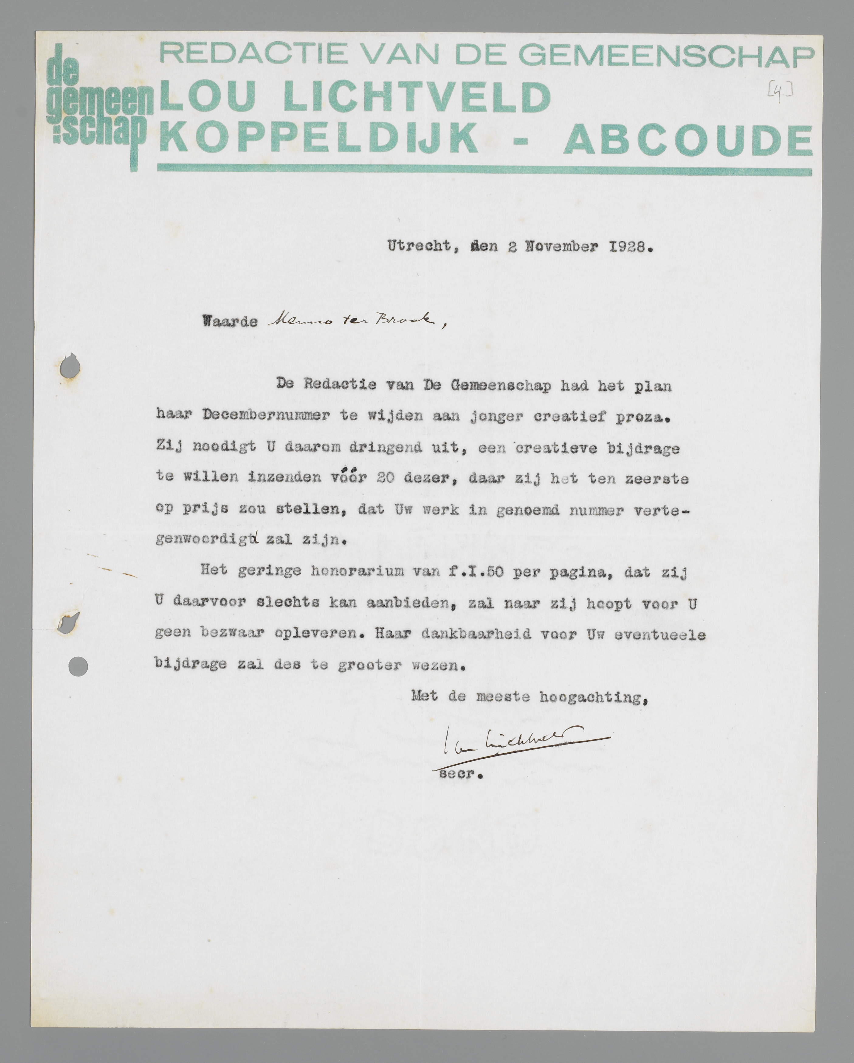 De Redactie van De Gemeenschap had het plan haar Decembernummer te wijden aan jonger creatief proza. Zij noodigt U daarom dringend uit, een creatieve bijdrage te willen inzenden vóór 20 dezer, daar zij het ten zeerste op prijs zou stellen, dat Uw werk in genoemd nummer vertegenwoordigd zal zijn.