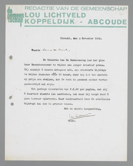 Het geringe honorarium van f.1,50 per pagina, dat zij U daarvoor slechts kan aanbieden, zal naar zij hoopt voor U geen bezwaar opleveren. Haar dankbaarheid voor Uw eventueele bijdrage zal des te grooter wezen.