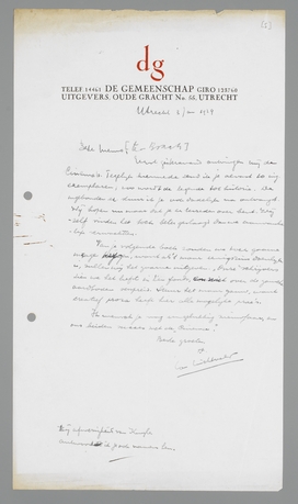Van je volgende boek zouden we toch gaarne inzage krijgen, want als 't maar eenigszins doenlijk is, zullen wij het gaarne uitgeven. ‘Onze’ schrijvers zien we het liefst in één fonds, en niet over de gansche aardbodem verspreid. Stuur het maar gauw, want creatief proza heeft hier alle mogelijke prae's.