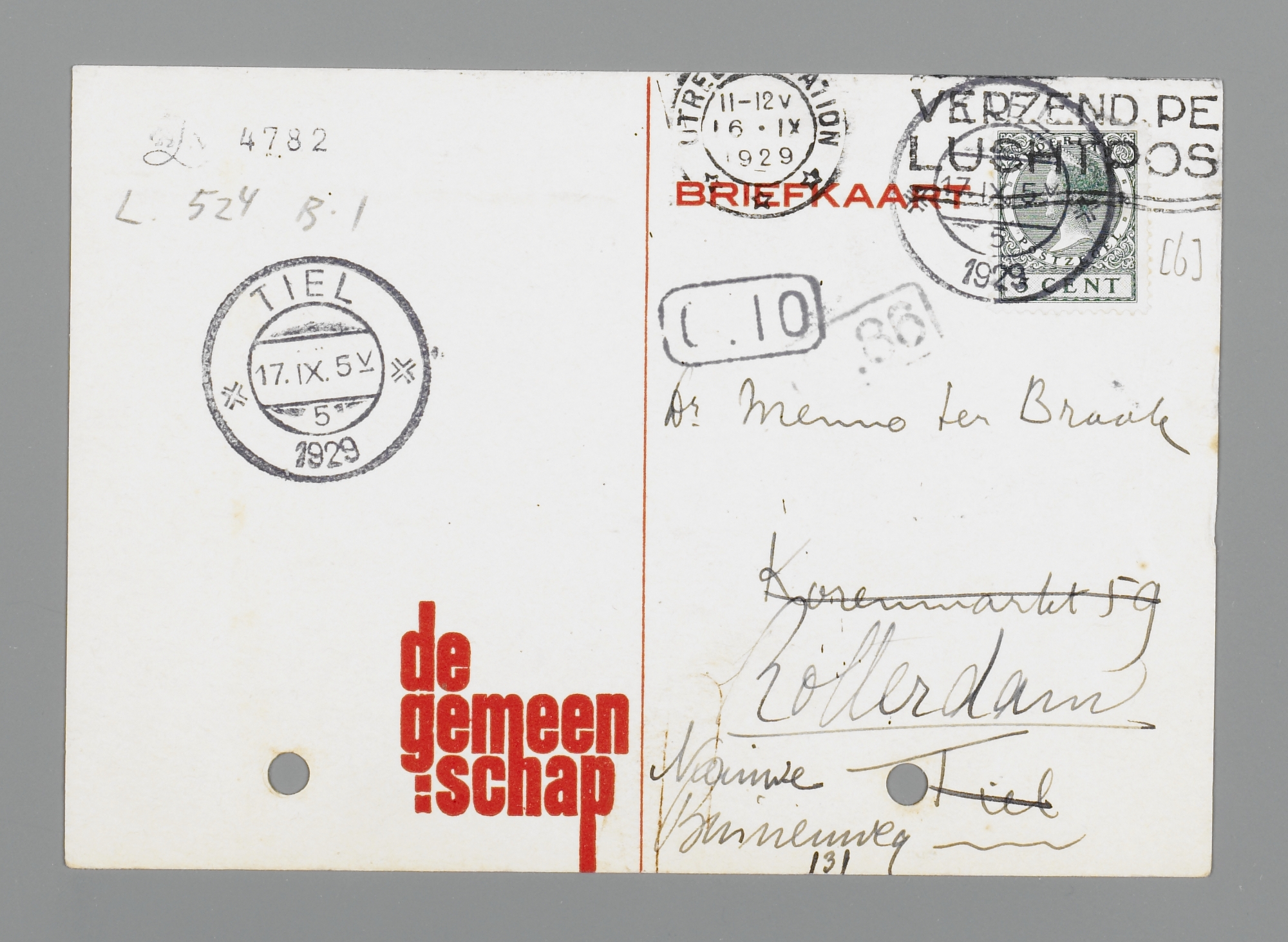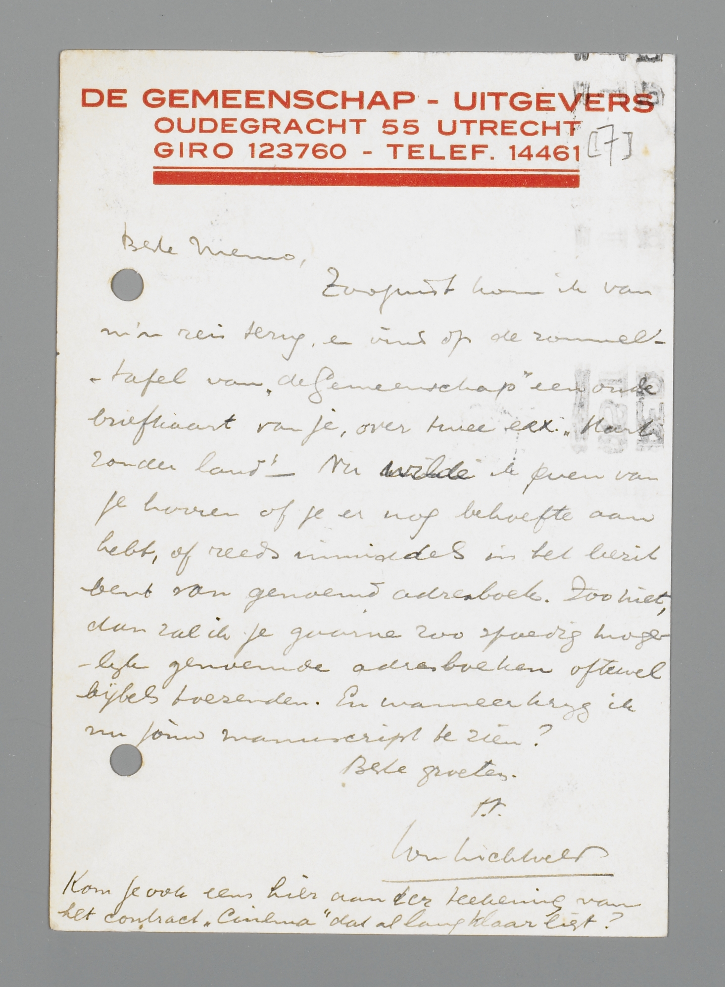 Zoojuist kom ik van m'n reis terug, en vind op de rommeltafel van ‘de Gemeenschap’ een oude briefkaart van je, over twee exx. ‘Hart zonder land’ - Nu wilde ik even van je horen of je er nog behoefte aan hebt, of reeds inmiddels in het bezit bent van genoemd adresboek. Zoo niet, dan zal ik je gaarne zoo spoedig mogelijk genoemde adresboeken oftewel bijbels toezenden. En wanneer krijg ik nu jouw manuscript te zien?