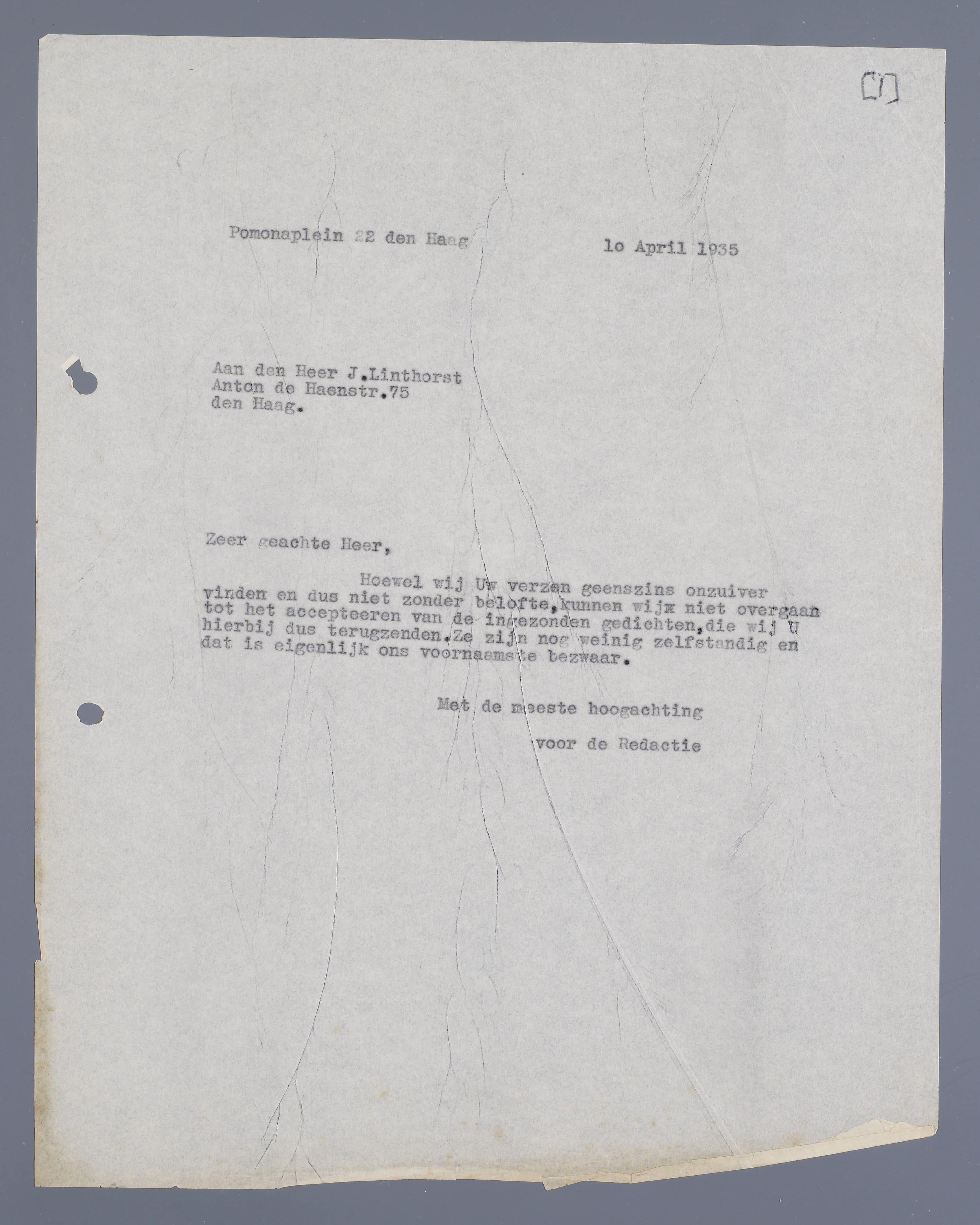 Hoewel wij Uw verzen geenszins onzuiver vinden en dus niet zonder belofte, kunnen wij niet overgaan tot het accepteeren van de ingezonden gedichten, die wij U hierbij dus terugzenden. Ze zijn nog weinig zelfstandig en dat is ons voornaamste bezwaar.