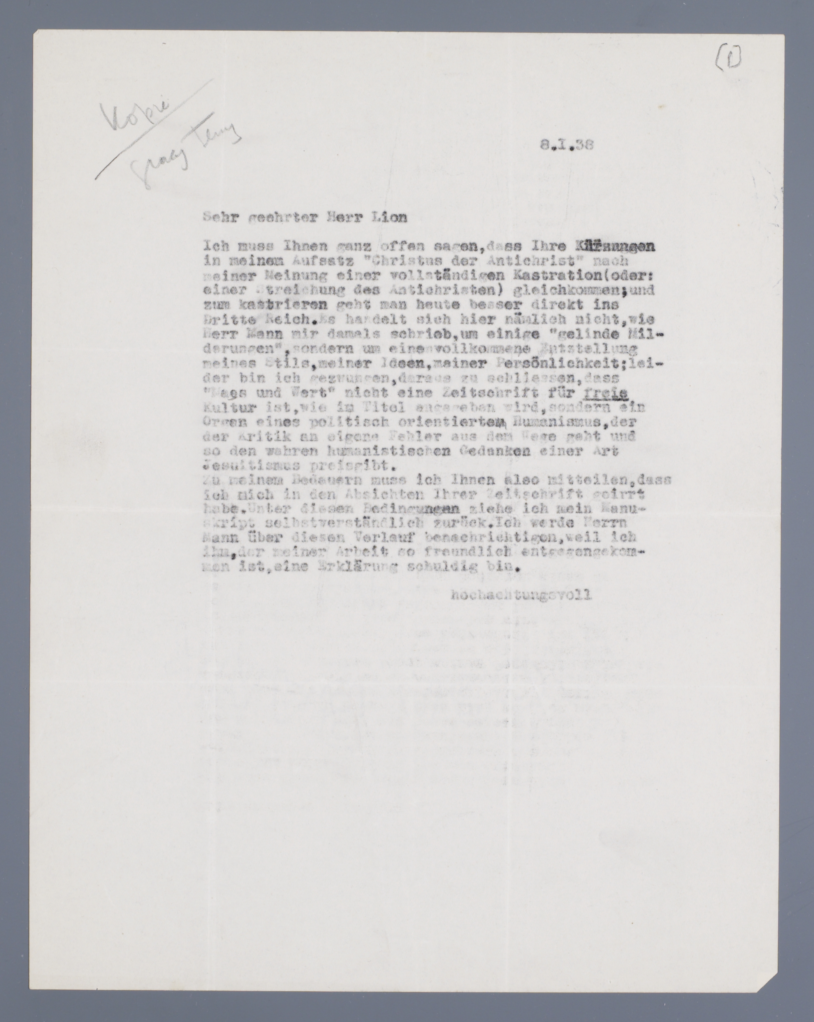 Zu meinem Bedauern muss ich Ihnen also mitteilen, dass ich mich in den Absichten Ihrer Zeitschrift geirrt habe. Unter diesen Bedingungen ziehe ich mein Manuskript selbstverständlich zurück. Ich werde Herrn Mann über diesen Verlauf benachrichtigen, weil ich ihm, der meiner Arbeit so freundlich entgegengekommen ist, eine Erklärung schuldig bin.
