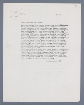Ich muss Ihnen ganz offen sagen, dass Ihre Kürzungen in meinem Aufsatz ‘Christus der Antichrist’ nach meiner Meinung einer vollständigen Kastration (oder: einer Streichung des Antichristen) gleichkommen; und zum kastrieren geht man heute besser direkt ins Dritte Reich. Es handelt sich hier nämlich nicht, wie Herr Kann mir damals schrieb, um einige ‘gelinde Milderungen, sondern um einen volkommene Entstellung meines Stils, meiner Ideen, meiner Persönlichkeit; leider bin ich gezwungen, daraus zu schliessen, dass ‘Mass und Wert’ nicht eine Zeitschrift für freie Kultur ist, wie im Titel angegeben wird, sondern ein Organ eines politisch orientierten Humanismus, der der Kritik an eigene Fehler aus dem Wege geht und so den waren humanistischen Gedanken einer Art Jesuitismus preisgibt.