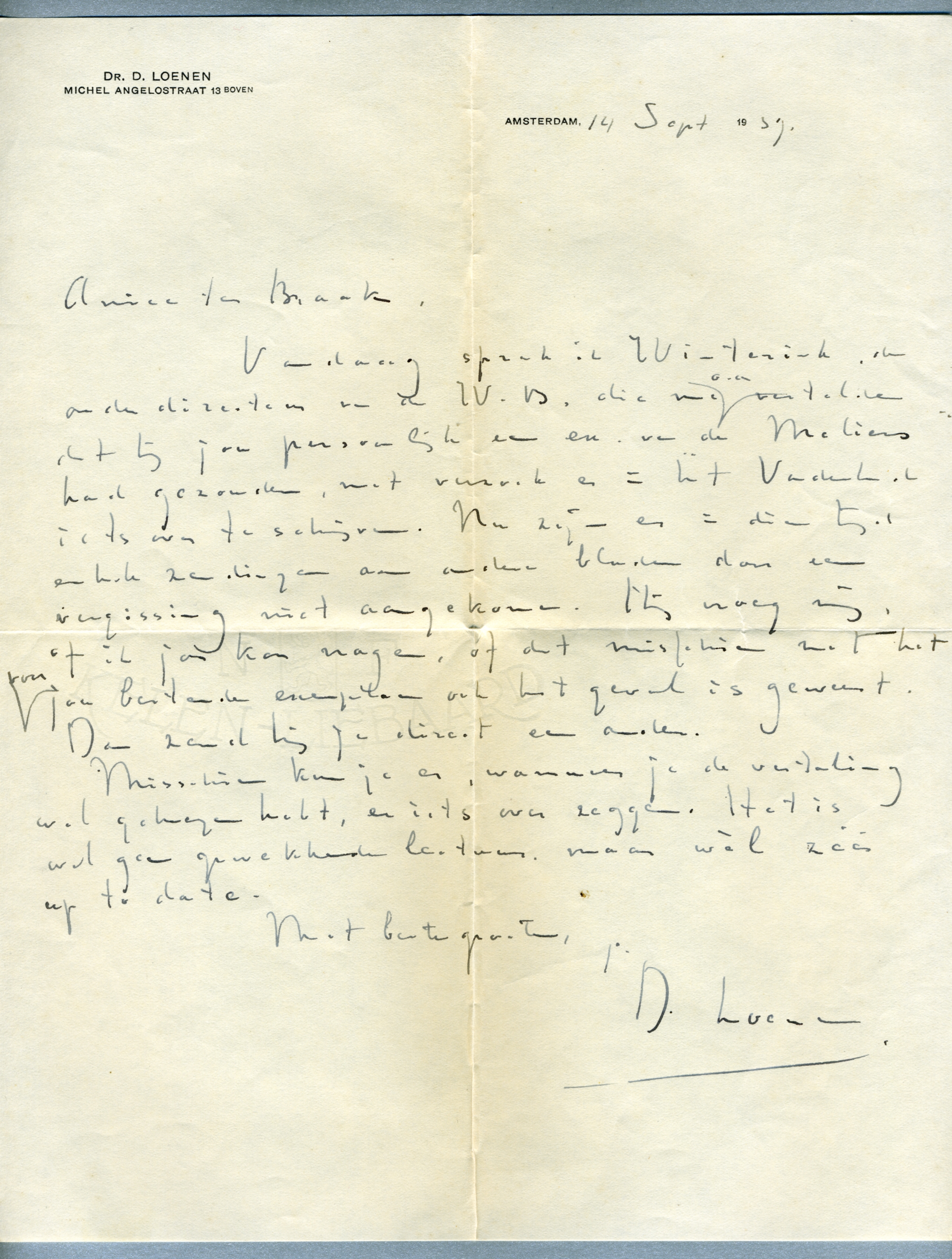 Vandaag sprak ik Winterink de onderdirecteur van de W.B., die mij o.a. vertelde dat hij jou persoonlijk een van de Meliërs had gezonden, met verzoek er in het Vaderland iets over te schrijven. Nu zijn er in dien tijd enkele zendingen aan andere bladen door een vergissing niet aangekomen. Hij vroeg mij, of ik jou kon vragen, of dit misschien met het voor jou bestemde exemplaar ook het geval is geweest.