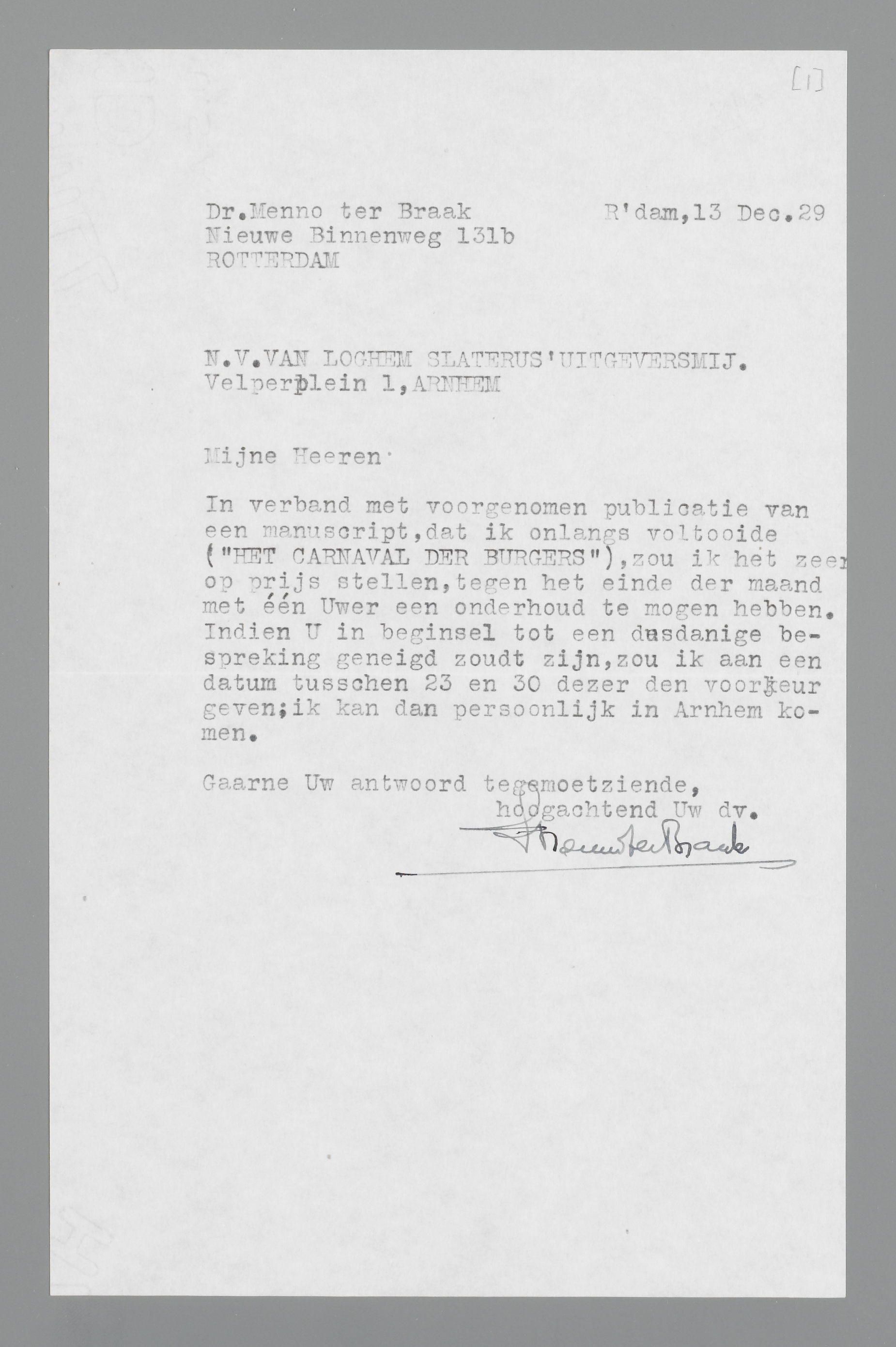 In verband met voorgenomen publicatie van een manuscript, dat ik onlangs voltooide (‘HET CARNAVAL DER BURGERS’), zou ik het zeer op prijs stellen, tegen het einde der maand met één Uwer een onderhoud te mogen hebben. Indien U in beginsel tot een dusdanige bespreking geneigd zoudt zijn, zou ik aan een datum tusschen 23 en 30 dezer den voorkeur geven; ik kan dan persoonlijk in Arnhem komen.