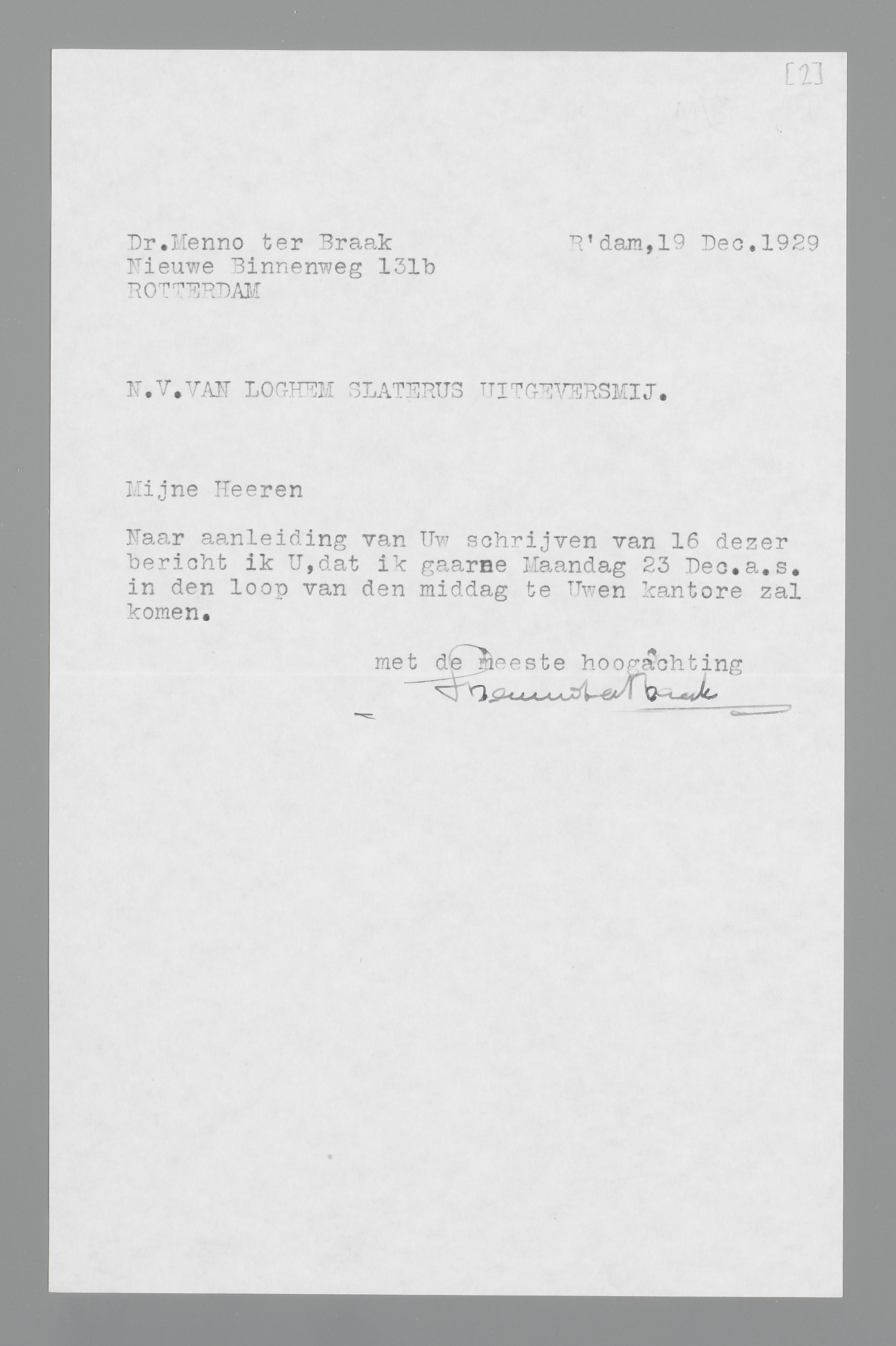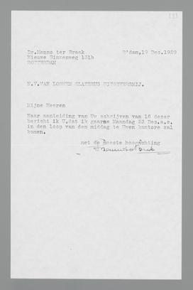 Naar aanleiding van Uw schrijven van 16 dezer bericht ik U, dat ik gaarne Maandag 23 Dec. a.s. in den loop van den middag te Uwen kantore zal komen.