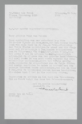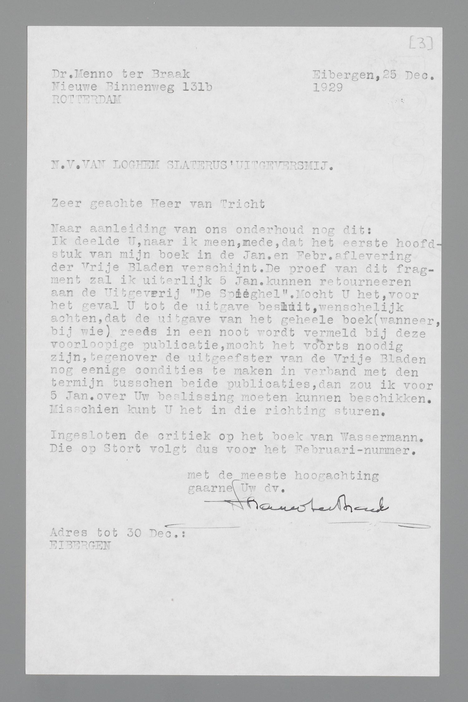 Naar aanleiding van ons onderhoud nog dit: Ik deelde U, naar ik meen, mede, dat het eerste hoofdstuk van mijn boek in de Jan. en Febr. aflevering der Vrije Bladen verschijnt. De proef van dit fragment zal ik uiterlijk 5 Jan. kunnen retourneeren aan de Uitgeverij ‘De Spieghel’. Mocht U het, voor het geval U tot de uitgave besluit, wenschelijk achten, dat de uitgave van het geheele boek (wanneer en bij wie) reeds in een noot wordt vermeld bij deze voorloopige publicatie, mocht het voorts noodig zijn, tegenover de uitgeefster van de Vrije Bladen nog eenige condities te maken in verband met den termijn tusschen beide publicaties, dan zou ik voor 5 Jan. over Uw beslissing moeten kunnen beschikken. Misschien kunt U het in die richting sturen.