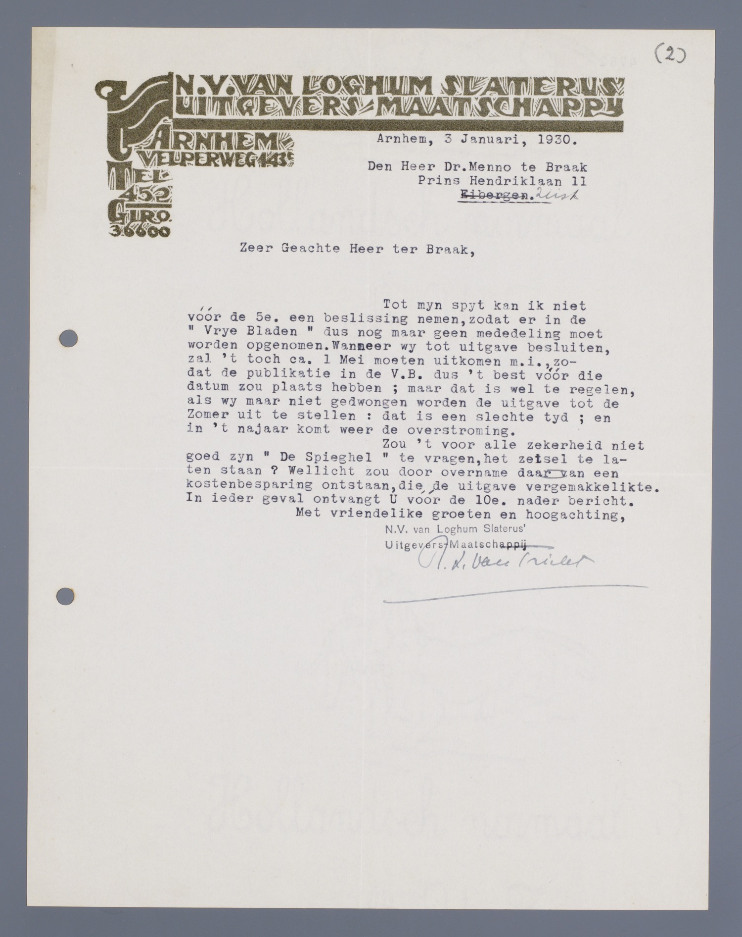 Zou 't voor alle zekerheid niet goed zyn ‘De Spiegel’ te vragen, het zetsel te laten staan? Wellicht zou door overname daarvan een kostenbesparing ontstaan, die de uitgave vergemakkelikte. In ieder geval ontvangt U voor de 10e nader bericht.
