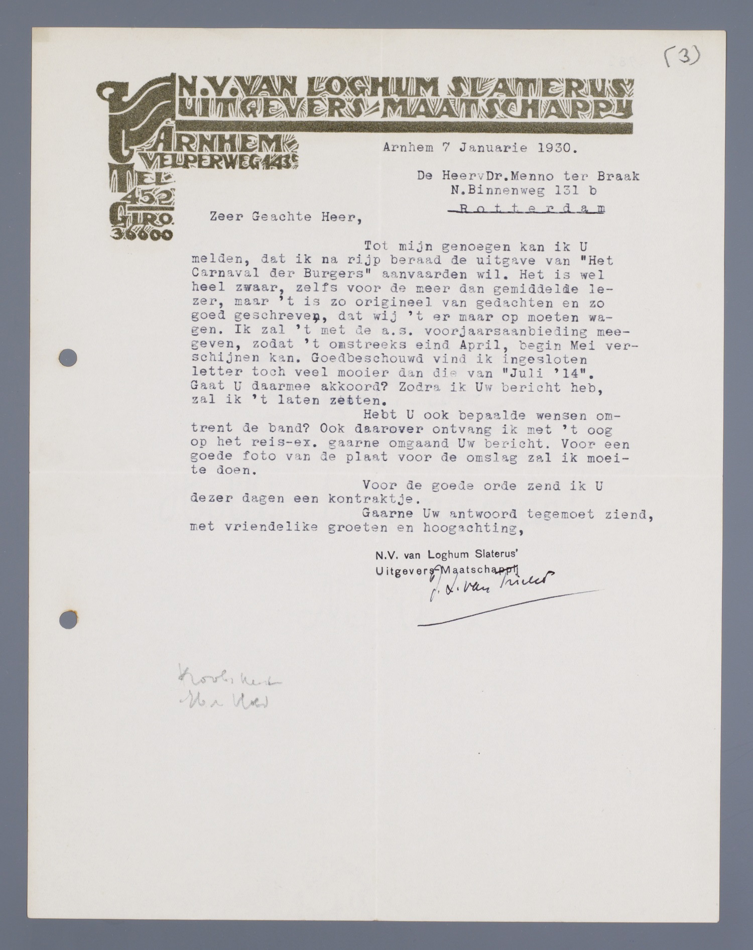 Tot mijn genoegen kan ik U melden, dat ik na rijp beraad de uitgave van ‘Het Carnaval der Burgers’ aanvaarden wil. Het is wel heel zwaar, zelfs voor de meer dan gemiddelde lezer, maar 't is zo orgineel van gedachten en zo goed geschreven, dat wij 't er maar op moeten wagen. Ik zal 't met de a.s. voorjaarsaanbieding meegeven, zodat 't omstreeks eind April, begin Mei verschijnen kan. Goedbeschouwd vind ik ingesloten letter toch veel mooier dan die van ‘Juli '14’. Gaat U daarmee akkoord? Zodra ik van Uw bericht heb, zal ik 't laten zetten.