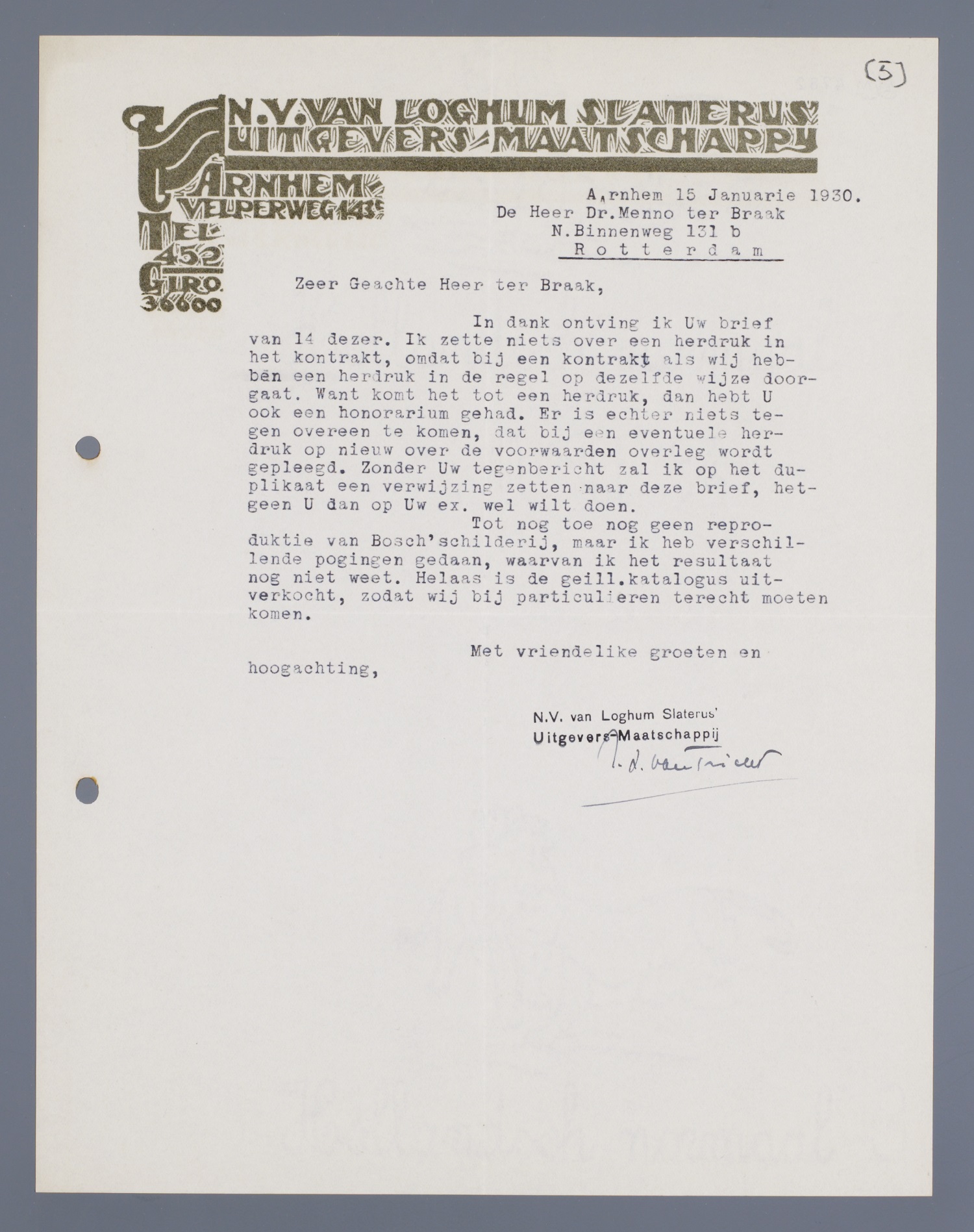 In dank ontving ik Uw brief van 14 dezer. Ik zette niets over een herdruk in het kontrakt, omdat bij een kontrakt als wij hebben een herdruk in de regel op dezelfde wijze doorgaat. Want komt het tot een herdruk, dan hebt U ook een honorarium gehad. Er is echter niets tegen overeen te komen, dat bij een eventuele herdruk op nieuw over de voorwaarden overleg wordt ghepleegd. Zonder Uw tegenbericht zal ik op het duplikaat een verwijzing zetten naar deze brief, hetgeen U dan op Uw ex. wel wilt doen.