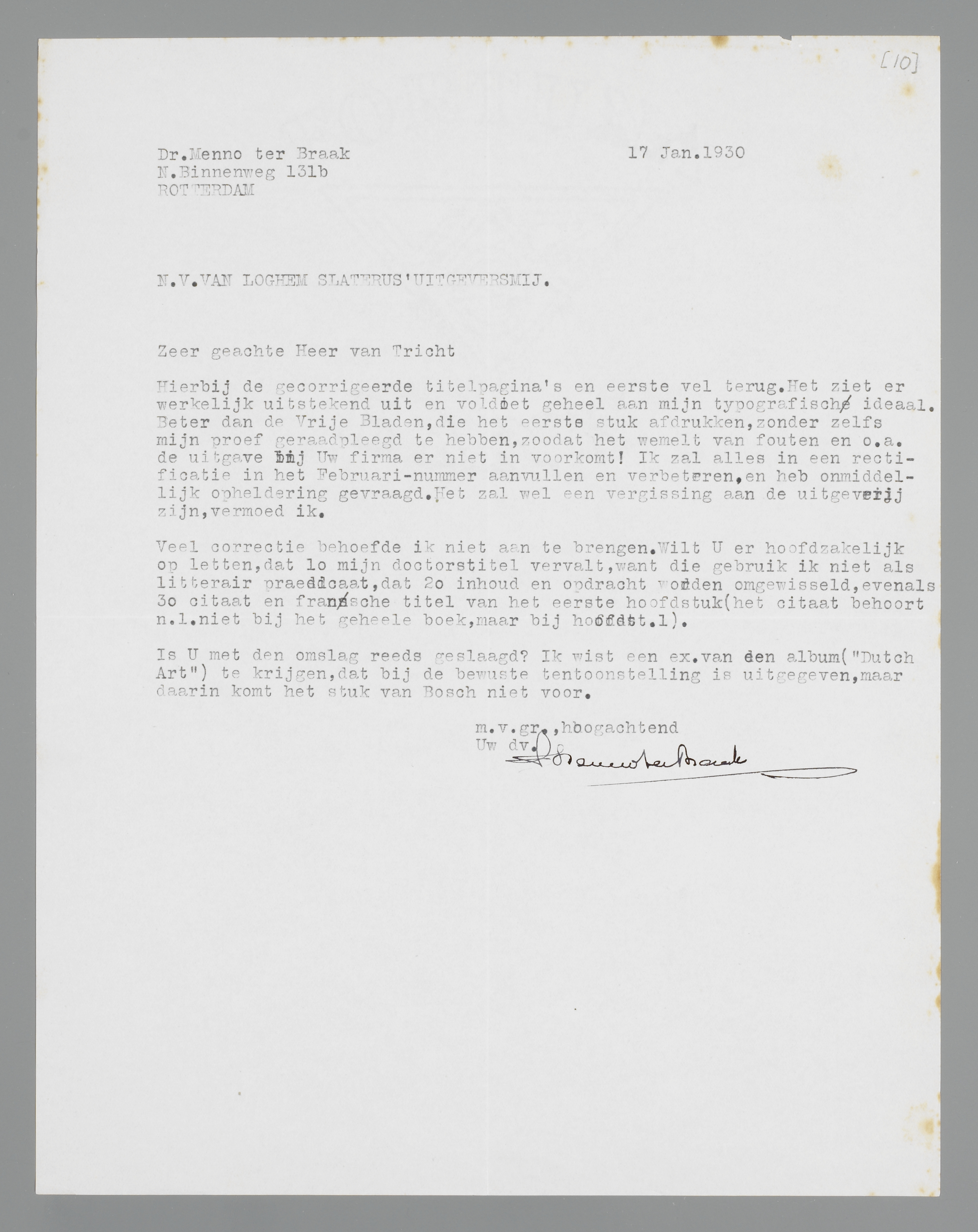 Hierbij de gecorrigeerde titelpagina's en eerste vel terug. Het ziet er werkelijk uitstekend uit en voldoet geheel aan mijn typografisch ideaal. Beter dan de Vrije Bladen, die het eerste stuk afdrukken zonder zelfs mijn proef geraadpleegd te hebben, zoodat het wemelt van de fouten en o.a. de uitgave bij Uw firma er niet in voorkomt! Ik zal alles in een rectificatie in het Februari-nummer aanvullen en verbeteren, en heb onmiddellijk opheldering gevraagd. Het zal wel een vergissing aan de uitgeverij zijn, vermoed ik.