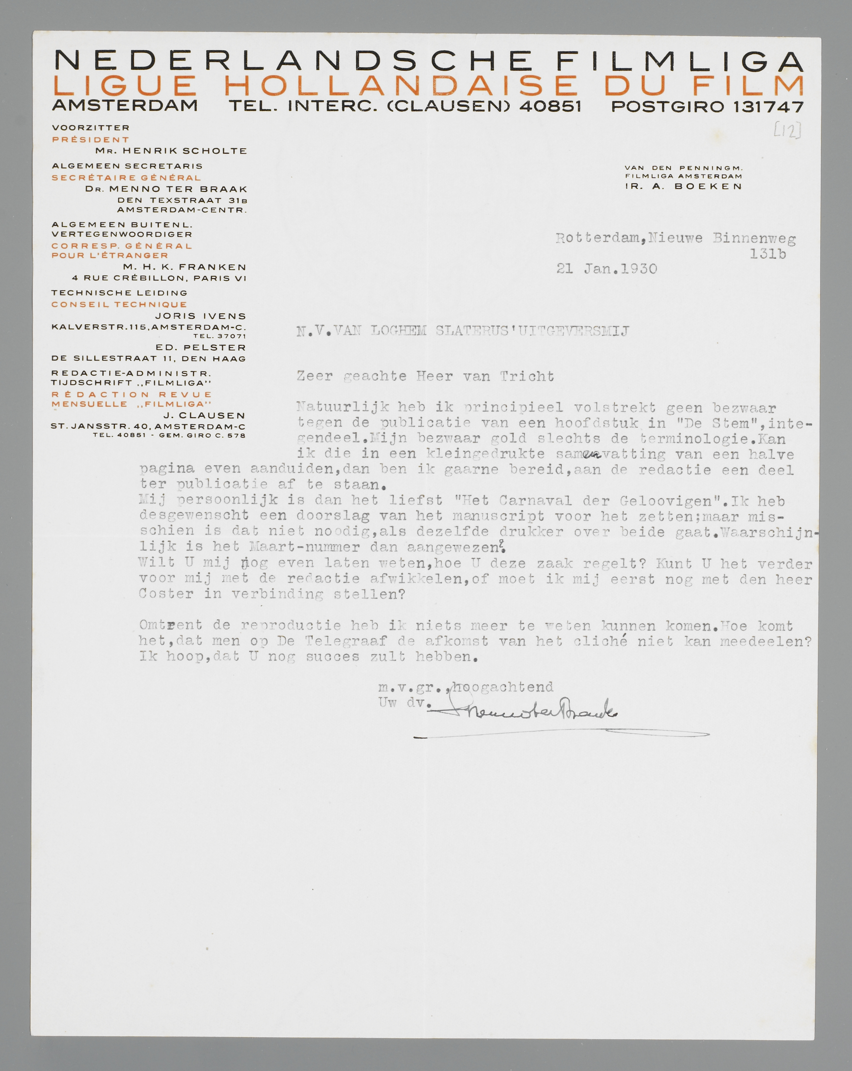 Mij persoonlijk is dan het liefst ‘Het Carnaval der Geloovigen’. Ik heb desgewenst een doorslag van het manuscript voor het zetten; maar misschien is dat niet noodig, als dezelfde drukker over beide gaat. Waarschijnlijk is het Maart-nummer dan aangewezen?