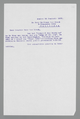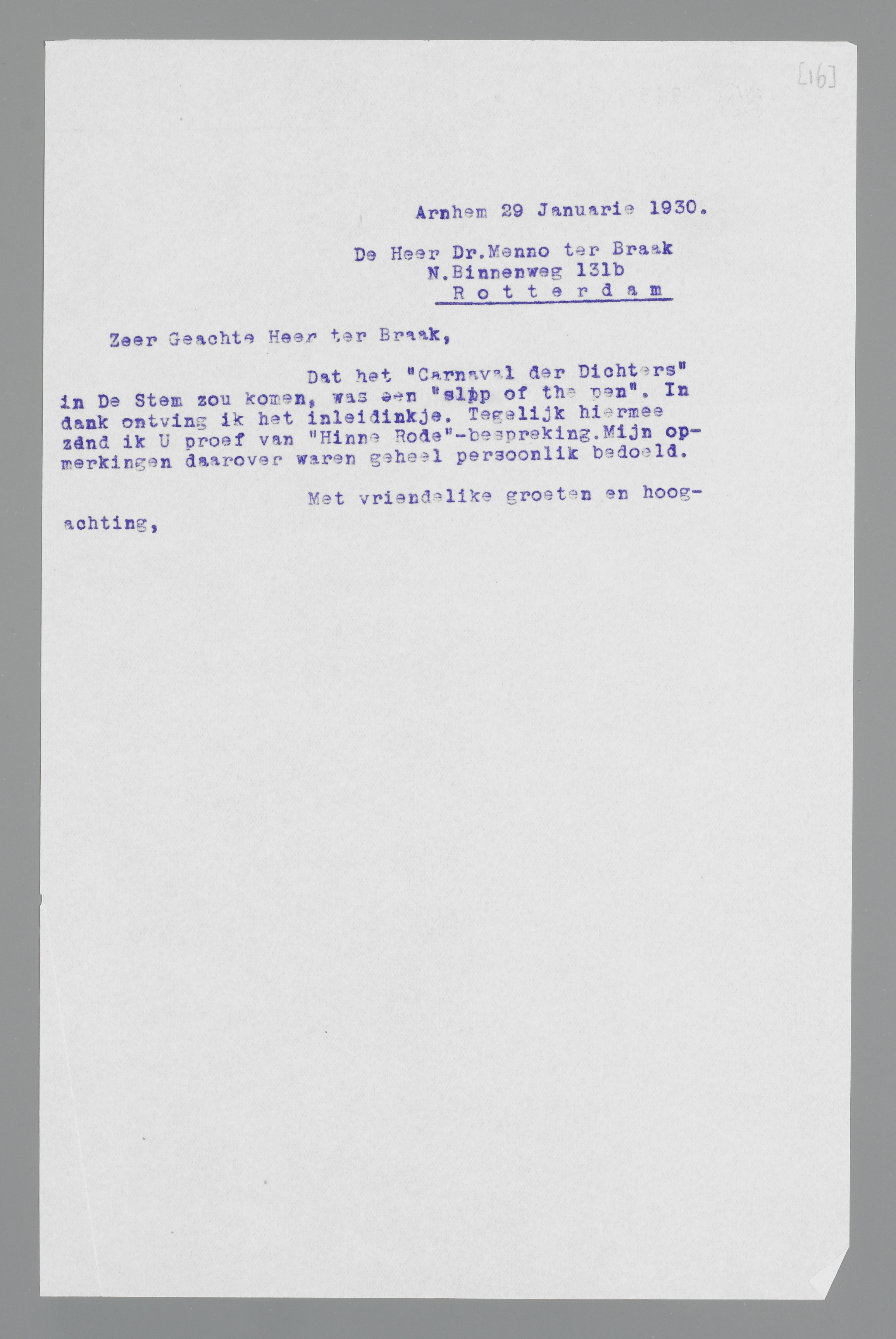 Dat het ‘Carnaval der Dichters’ in De Stem zou komen, was een ‘slip of the pen’. In dank ontving ik het inleidinkje. Tegelijk hiermee zend ik U proef van ‘Hinne rode’-bespreking. Mijn opmerkingen daarover waren geheel persoonlik bedoeld.
