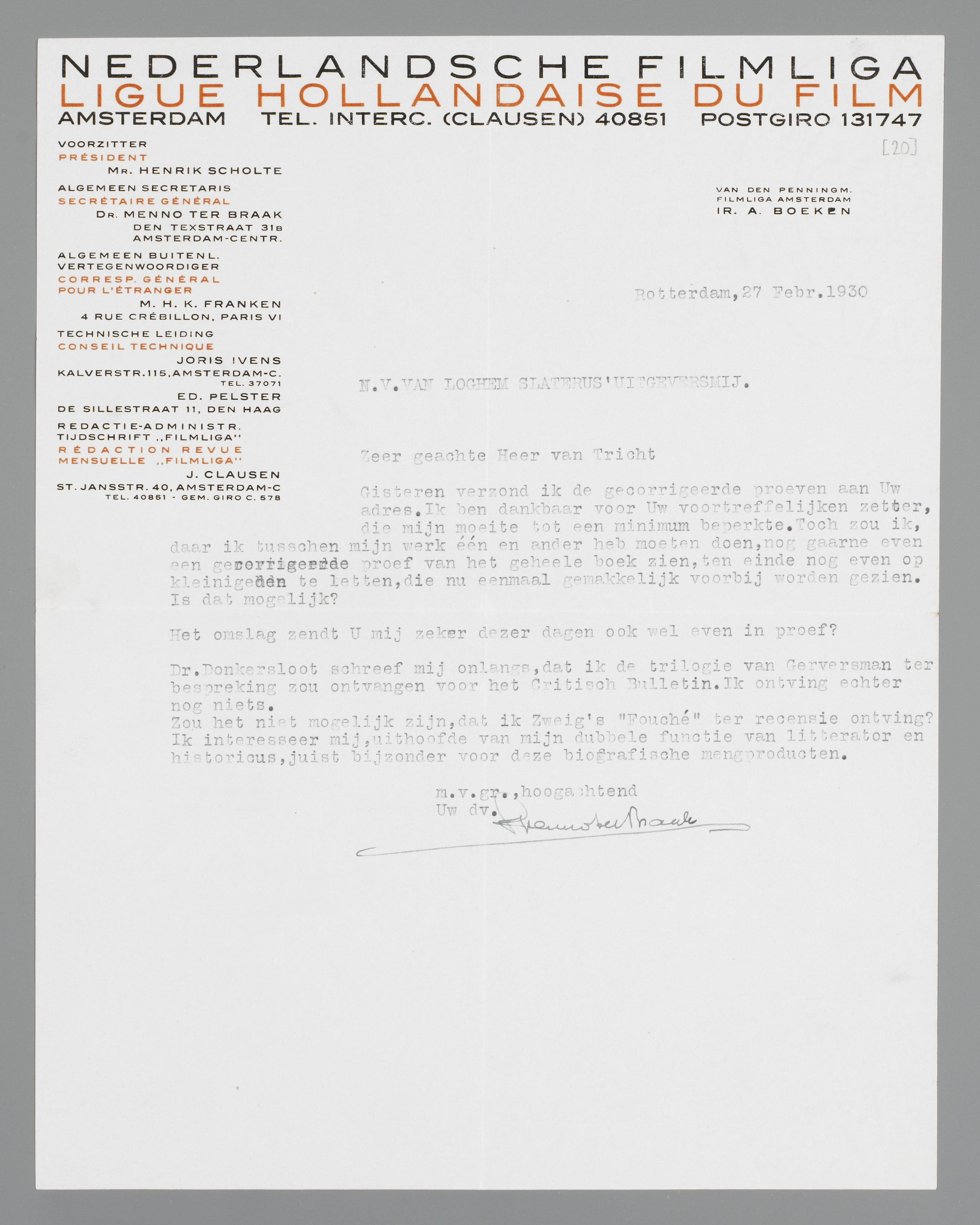 Dr. Donkersloot schreef mij onlangs, dat ik de trilogie van Gerversman ter bespreking zou ontvangen voor het Critisch Bulletin. Ik ontving echter nog niets. Zou het niet mogelijk zijn, dat ik Zweig's ‘Fouché’ ter recensie ontving? Ik interesseer mij, uit hoofde van mijn dubbele functie van litterator en historicus, juist bijzonder voor deze biografische mengproducten.