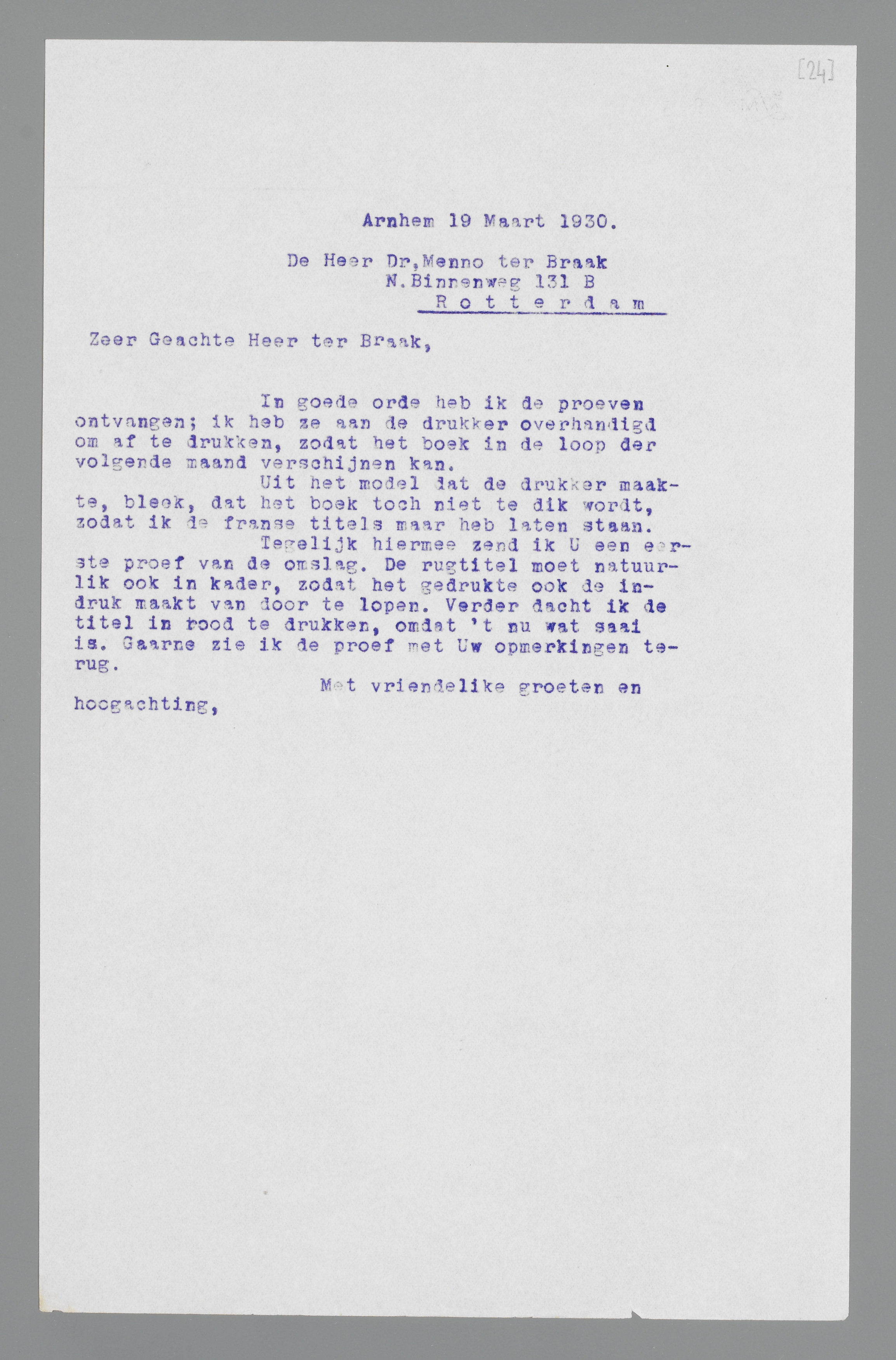 Tegelijk hiermee zend ik U een eerste proef van de omslag. De rugtitel moet natuurlik ook in kader, zodat het gedrukte ook de indruk maakt van door te lopen. Verder dacht ik de titel in rood te drukken, omdat 't nu wat saai is. Gaarne ziet ik de proef met Uw opmerkingen terug.