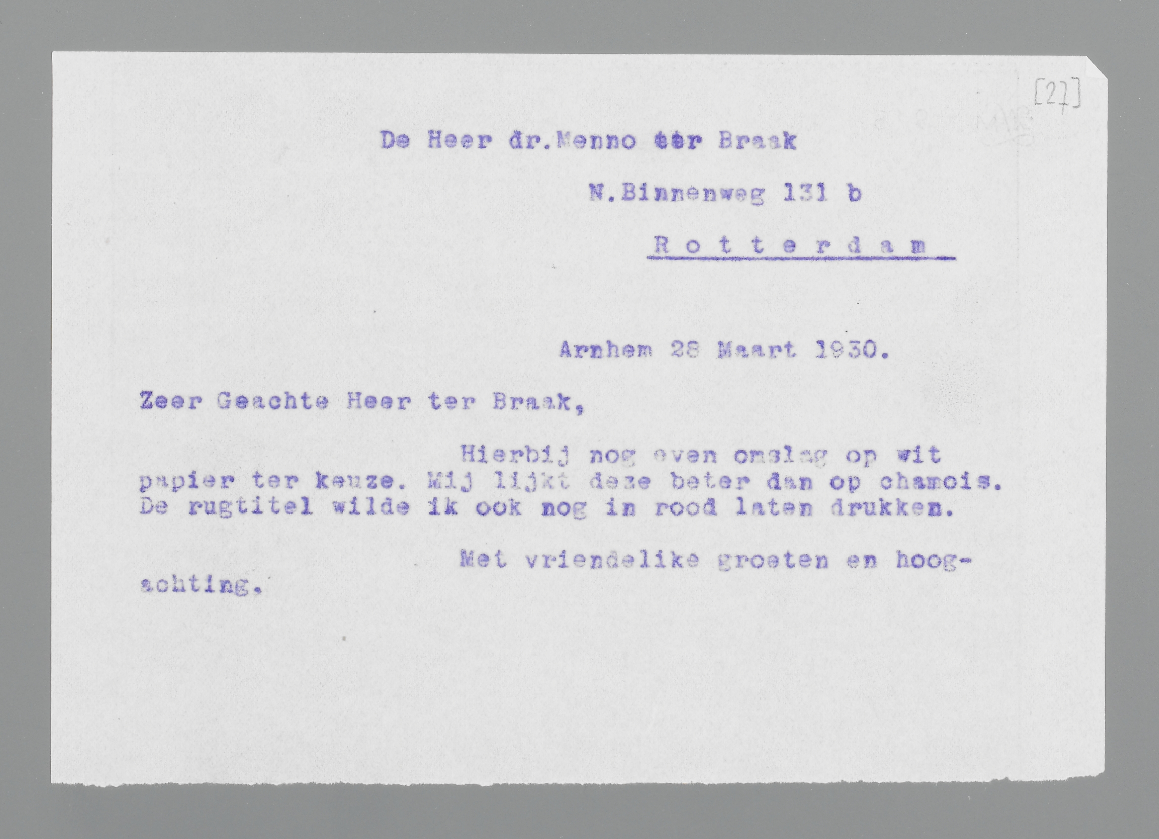 Hierbij nog even omslag op wit papier ter keuze. Mij lijkt deze beter dan op chamois. De rugtitel wilde ik ook nog in rood laten drukken.