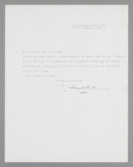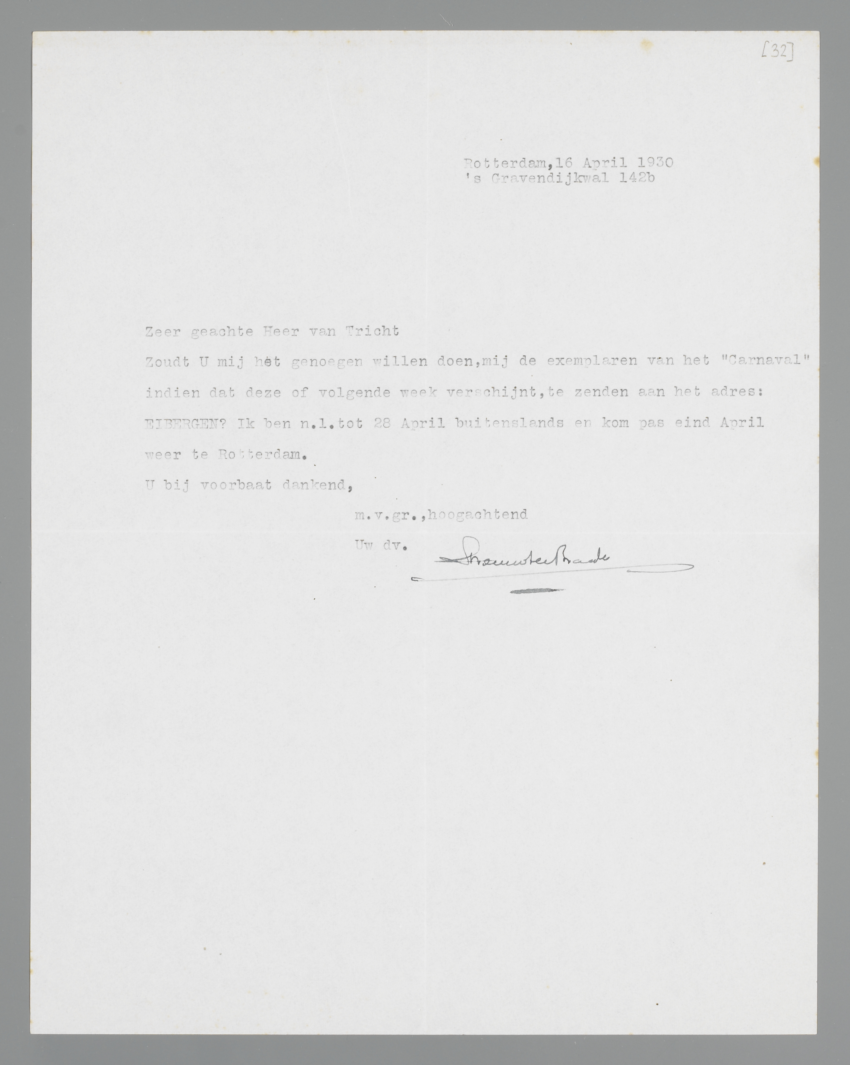 Zoudt U mij het genoegen willen doen, mij de exemplaren van het ‘Carnaval’ indien dat deze of volgende week verschijnt, te zenden aan het adres: EIBERGEN? Ik ben n.l. tot 28 April buitenslands en kom pas eind April weer te Rotterdam.
