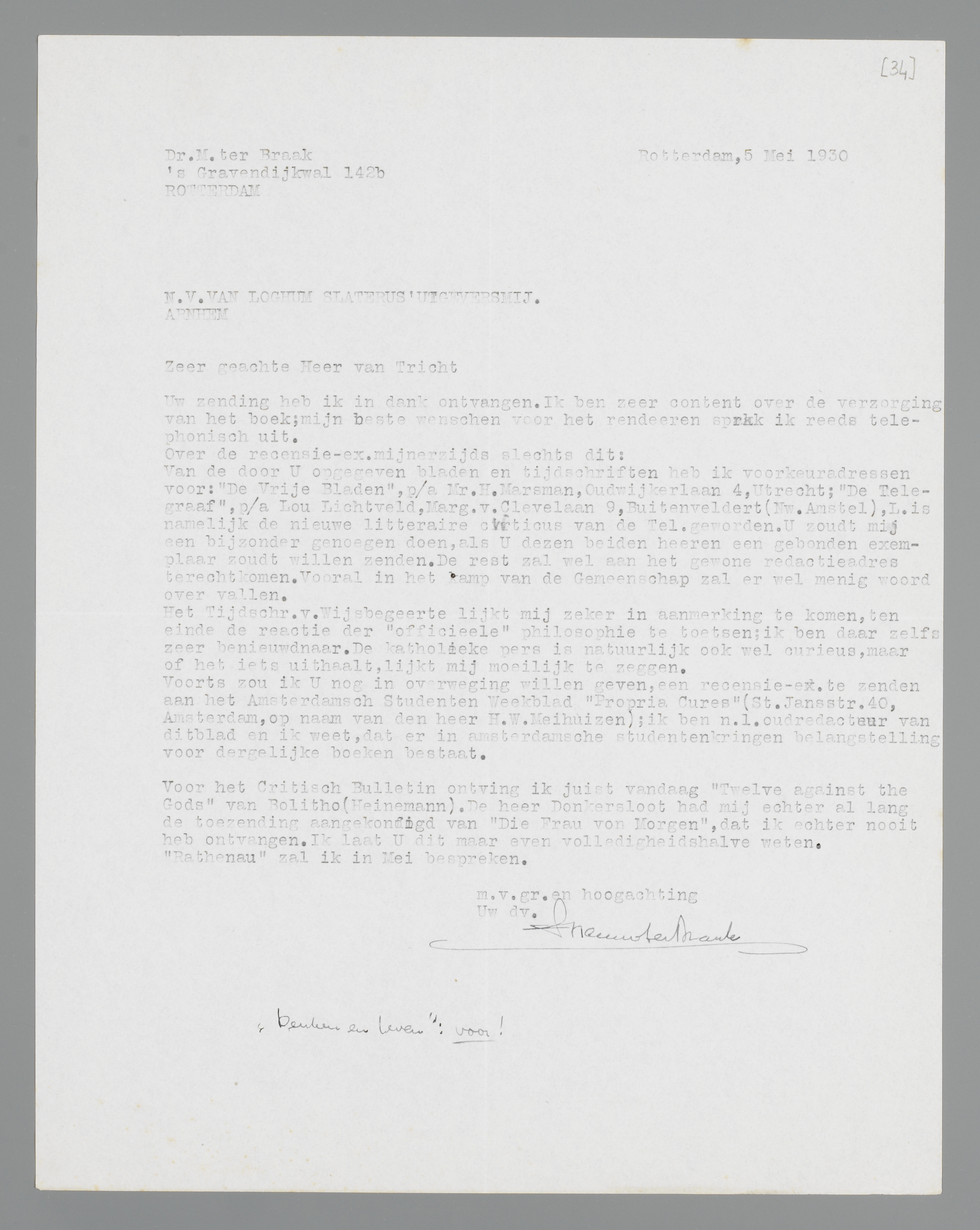 Voorts zou ik u nog in overweging willen geven, een recensie-ex. te zenden aan het Amsterdamsch Studenten Weekblad ‘Propria Cures’ (St. Jansstr.40, Amsterdam, op naam van den heer H.W. Meihuizen); ik ben n.l. oudredacteur van dit blad en ik weet, dat er in Amsterdamsche studentenkringen belangstelling voor dergelijke boeken bestaat.