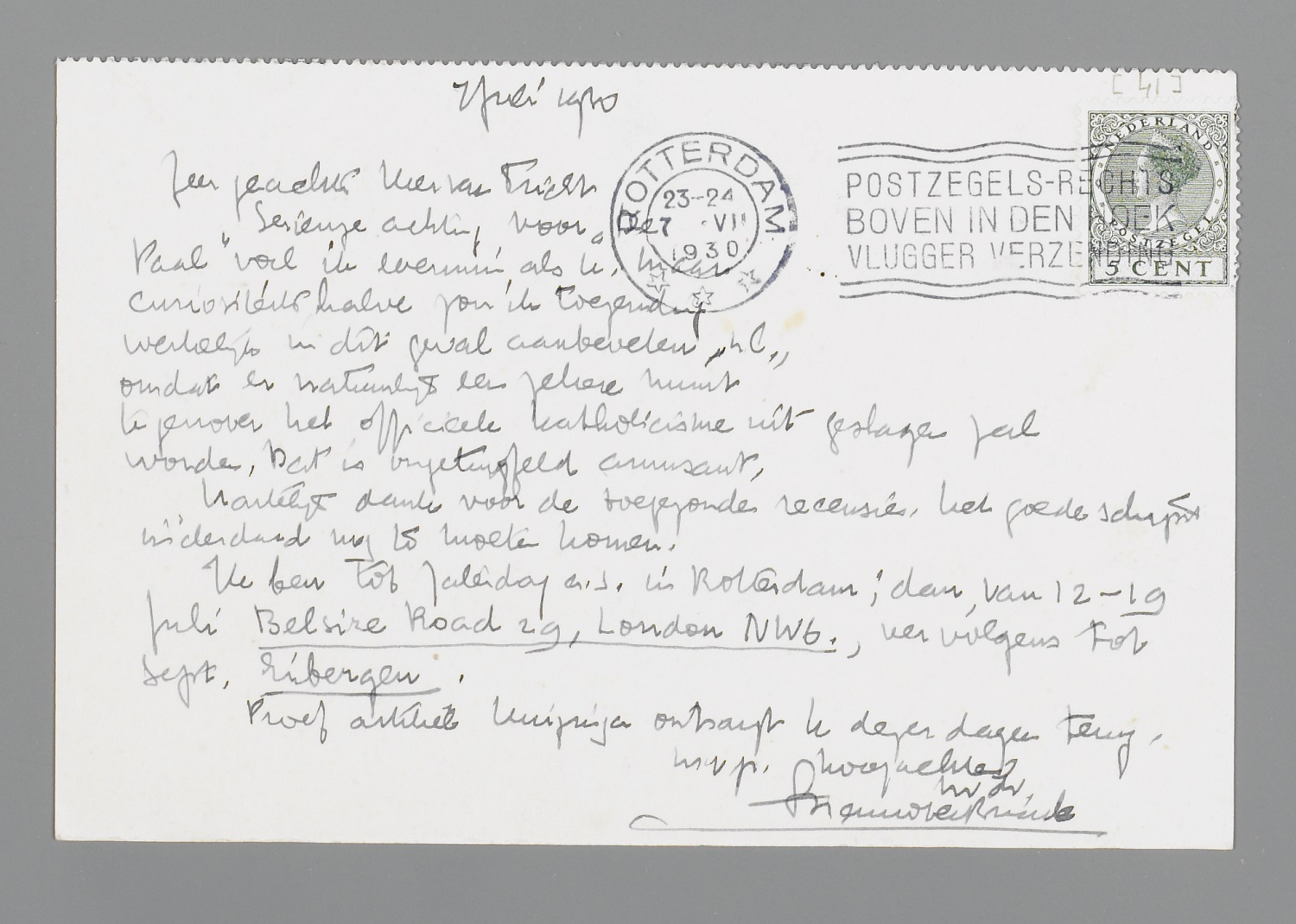 Ik ben tot Zaterdag a.s. in Rotterdam; dan van 12-19 Juli Belsize Road 19, London NW6., vervolgens tot Sept. Eibergen.