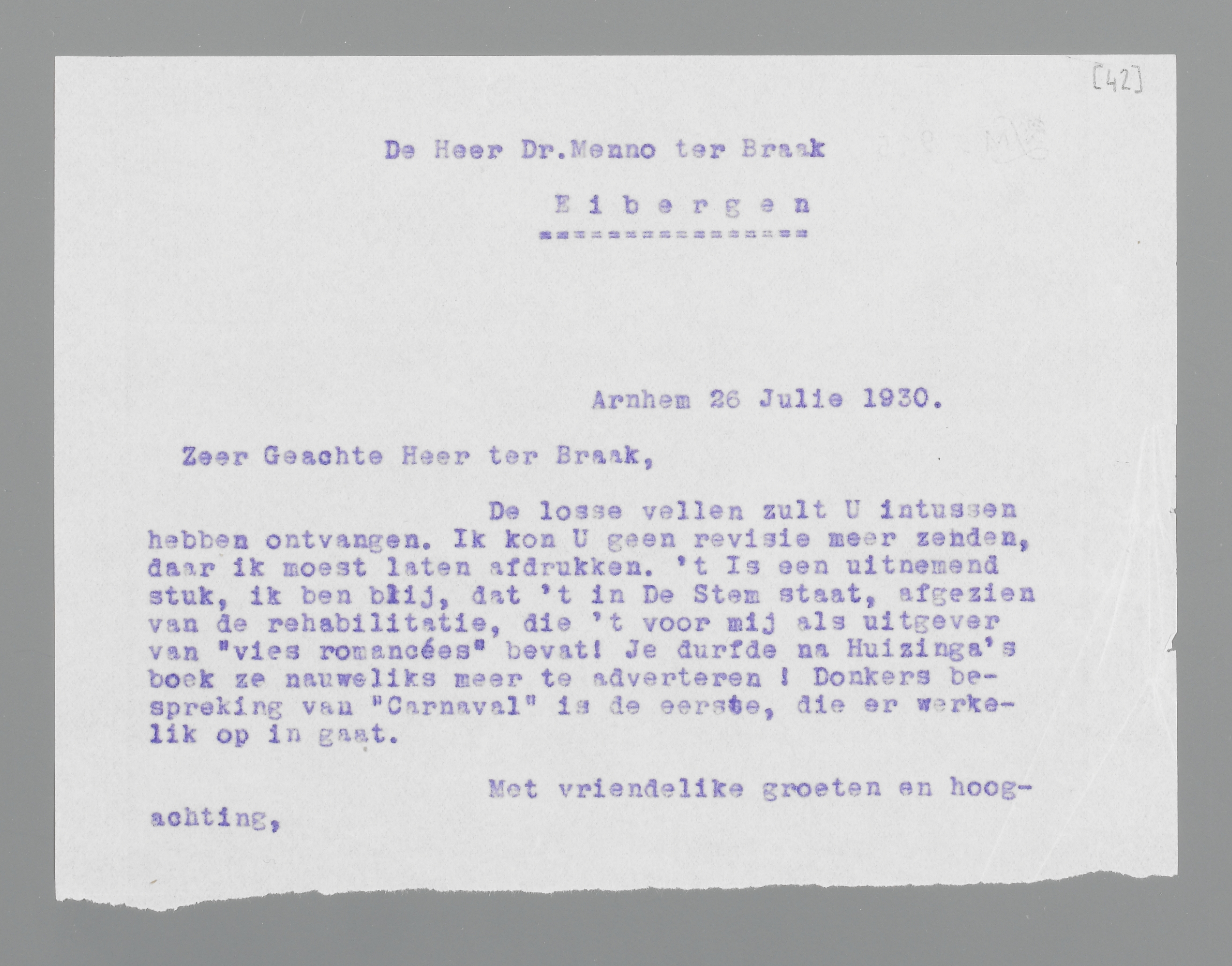 De losse vellen zult U intussen hebben ontvangen. Ik kon U geen revisie meer zenden, daar ik moest laten afdrukken. 't Is een uitnemend stuk, ik ben blij, dat 't in De Stem staat, afgezien van de rehabilitatie, die 't voor mij als uitgever van ‘vies romancées’ bevat! Je durfde na Huizinga's boek ze nauweliks meer te adverteren! Donkers bespreking van ‘Carnaval’ is de eerste, die er werkelik op in gaat.