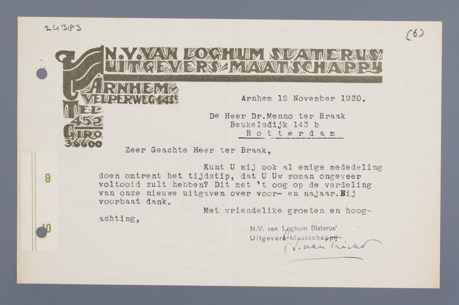 Kunt U mij ook al enige mededeling doen omtrent het tijdstip, dat U Uw roman ongeveer voltooid zult hebben? Dit met 't oog op de verdeling van onze nieuwe uitgaven over voor- en najaar. Bij voorbaat dank.