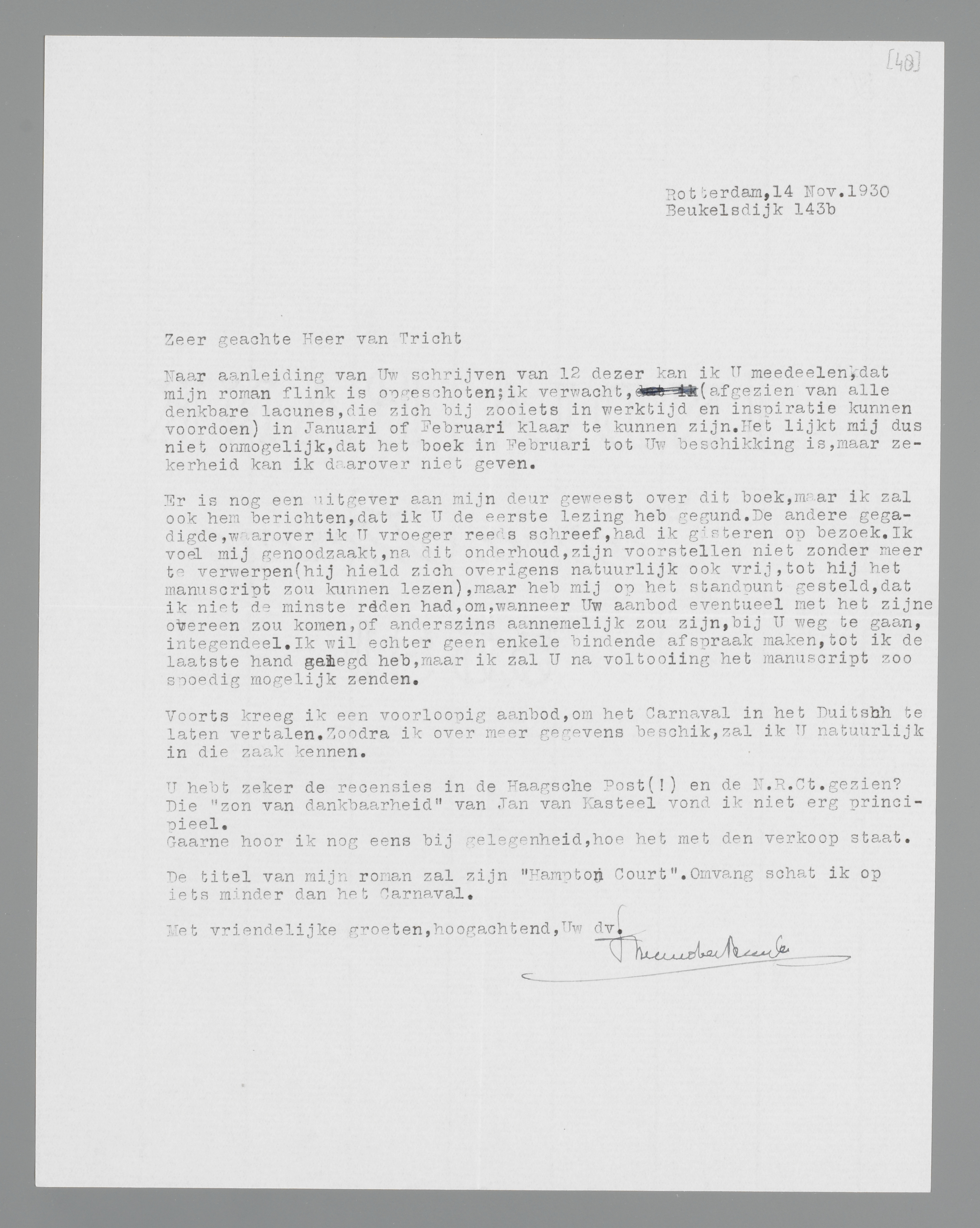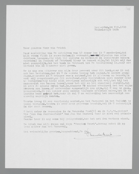 Naar aanleiding van Uw schrijven van 12 dezer kan ik U mededeelen, dat mijn roman flink is opgeschoten; ik verwacht, (afgezien van alle denkbare lacunes, die zich bij zooiets in werktijd en inspiratie kunnen voordoen) in Januari of Februari klaar te kunnen zijn. Het lijkt mij dus niet onmogelijk, dat het boek in Februari tot Uw beschikking is, maar zekerheid kan ik daarover niet geven.