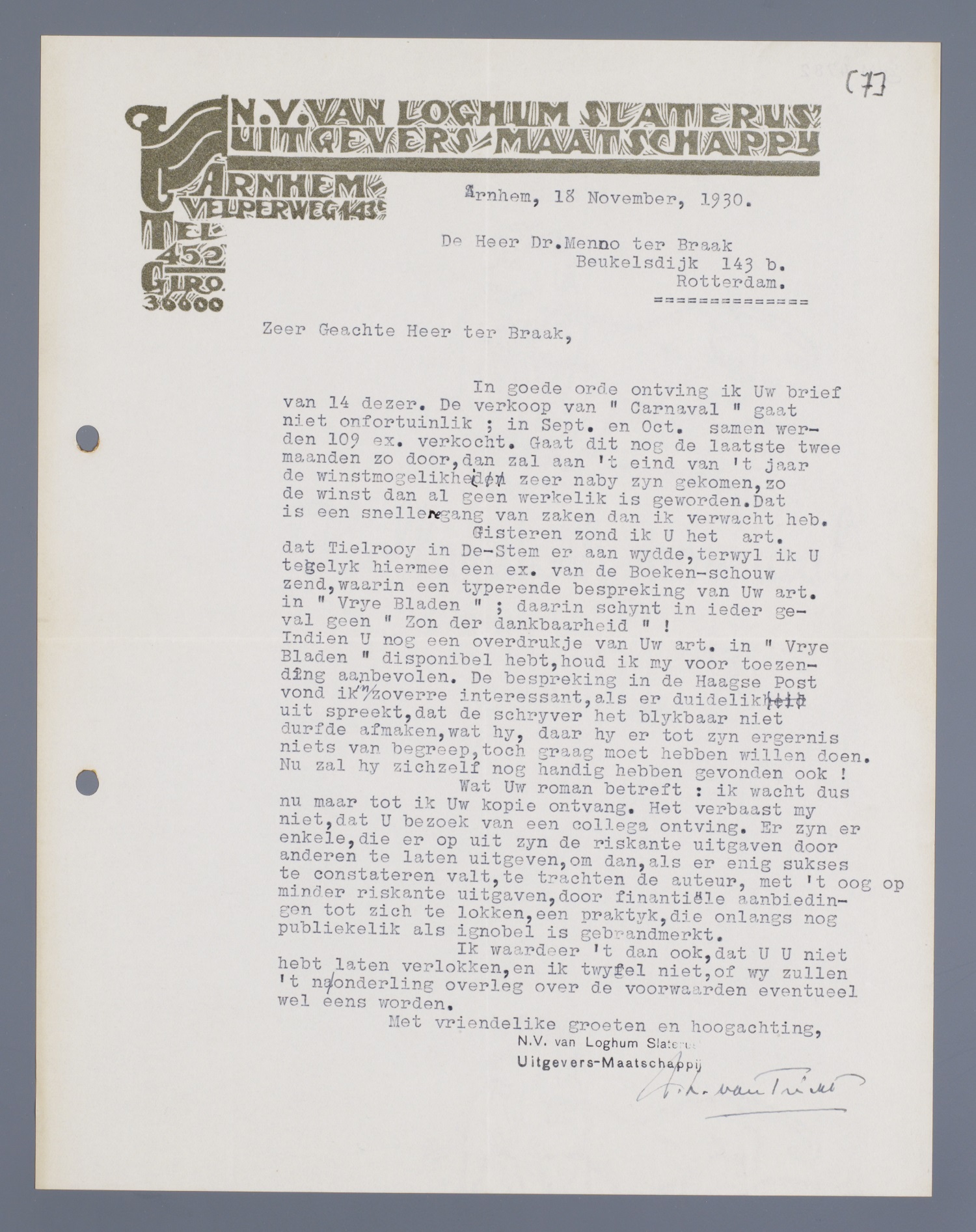 In goede orde ontving ik Uw brief van 14 dezer. De verkoop van ‘Carnaval’ gaat niet onfortuinlyk; in sept. en oct. samen werden 109 ex. verkocht. Gaat dit nog de laatste twee maanden zo door, dan zal aan 't eind van 't jaar de winstmogelikheden zeer naby zyn gekomen, zo de winst dan al geen werkelik is geworden. Dat is een snellere gang van zaken dan ik verwacht heb.