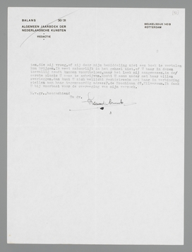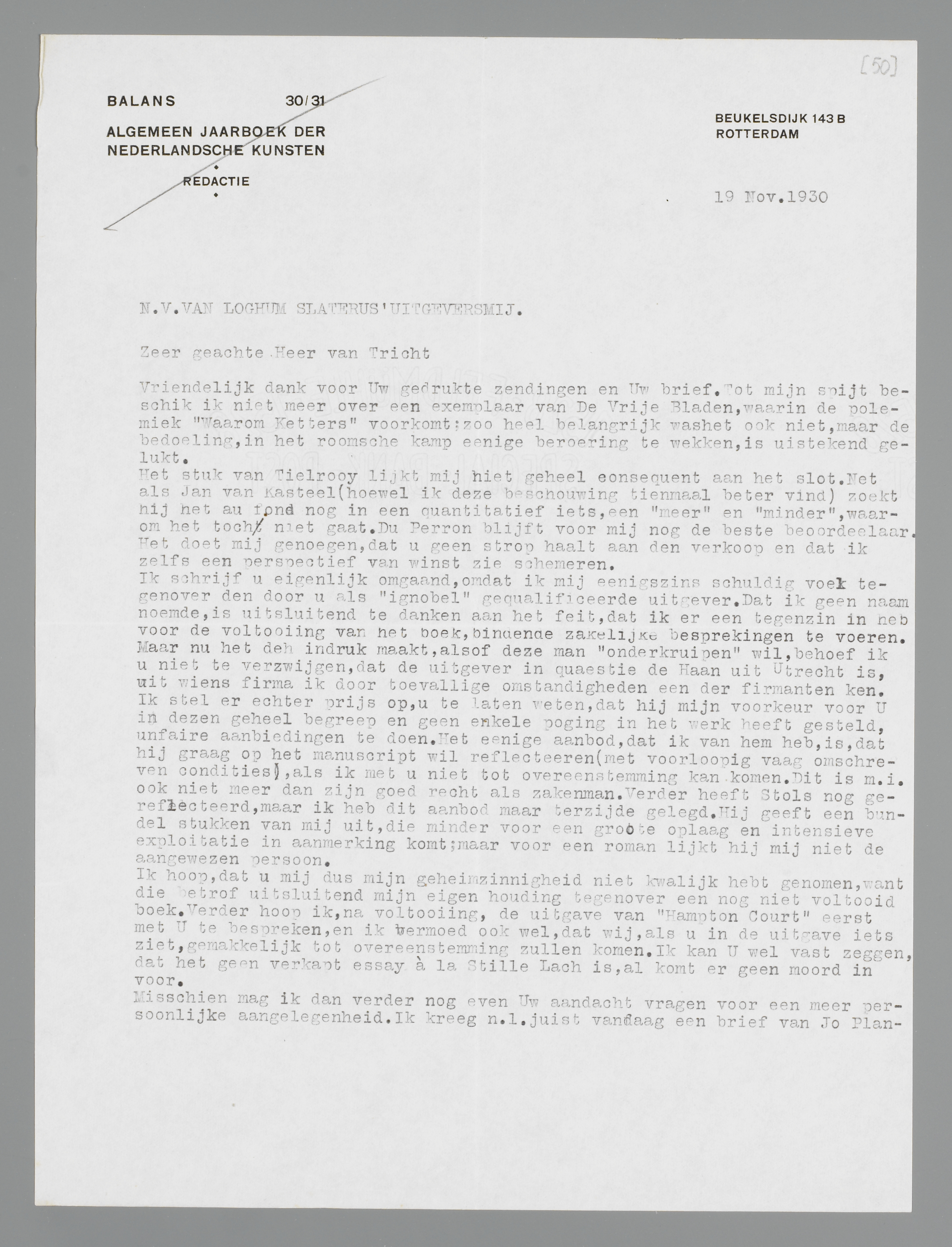 Ik schrijf u eigenlijk omgaand omdat ik mij eenigszins schuldig voel tegenover den door U als ‘ignobel’ gequalificeerde uitgever. Dat ik geen naam noemde, is uitsluitend te danken aan het feit, dat ik er een tegenzin in heb voor de voltooiing van het boek, bindende zakelijke besprekingen te voeren. Maar nu het de indruk maakt, alsof deze man ‘onderkruipen wil, behoef ik U niet te verzwijgen, dat de uitgever in quaestie de Haan uit Utrecht is, uit wiens firma ik door toevallige omstandigheden een der firmanten ken. Ik stel er echter prijs op, u te laten weten, dat hij mijn voorkeur voor U in dezen geheel begreep en geen enkele poging in het werk heeft gesteld, unfaire aanbiedingen te doen. Het eenige aanbod dat ik van hem heb, is, dat hij graag op het manuscript wil reflecteeren (met voorloopig vaag omschreven condities), als ik met U niet tot overeenstemming kan komen. Dit is m.i. ook niet meer dan zijn goed recht als zakenman. Verder heeft Stols nog gereflecteerd, maar ik heb dit aanbod maar terzijde gelegd. Hij geeft een bundel stukken van mij uit, die minder voor een groote oplaag en intensieve exploitatie in aanmerking komt; maar voor een roman lijkt hij mij niet de aangewezen persoon.