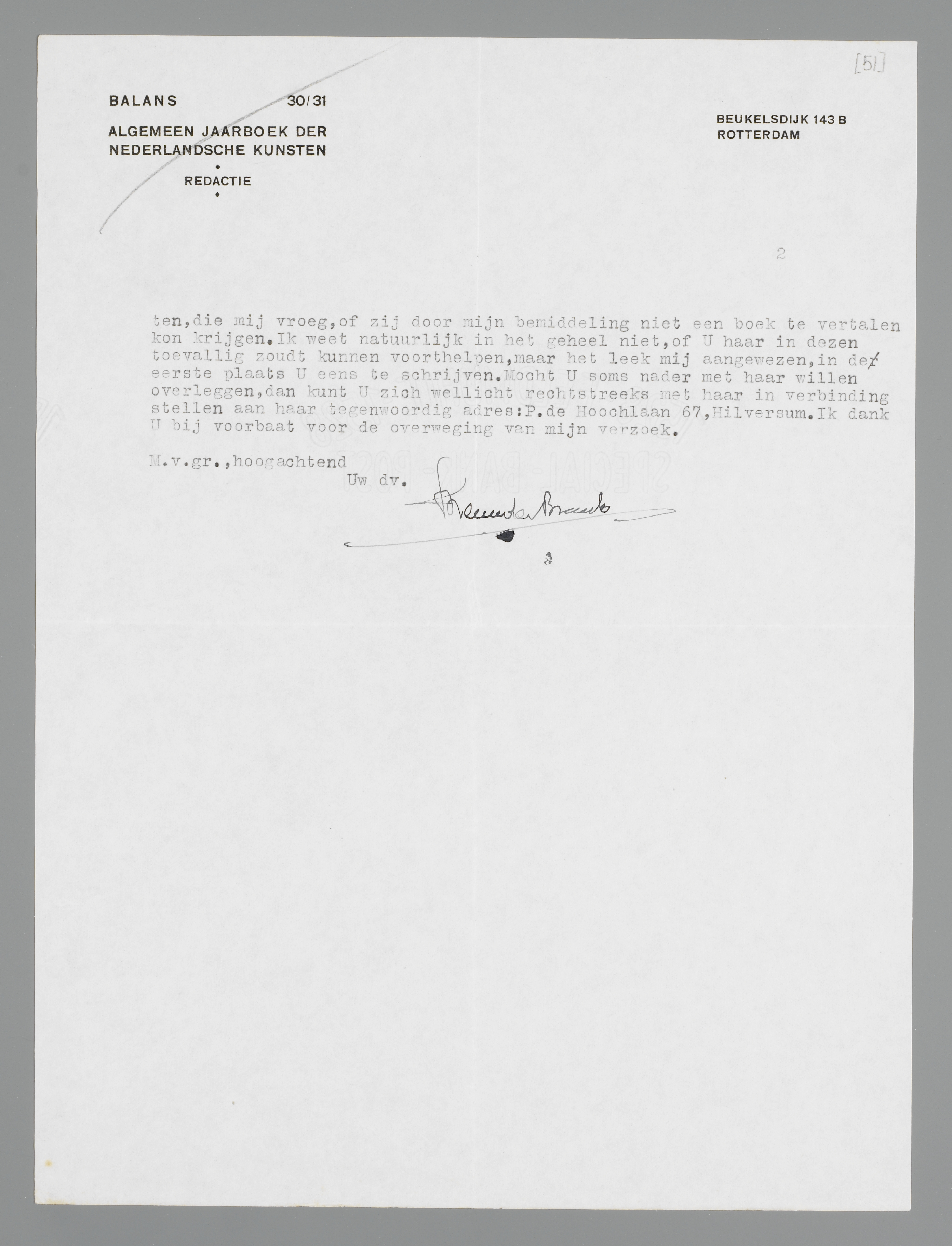 Misschien mag ik dan verder nog even Uw aandacht vragen voor een meer persoonlijke aangelegenheid. Ik kreeg n.l. juist vandaag een brief van Jo Planten, die mij vroeg, of zij door mijn bemiddeling niet een boek te vertalen kon krijgen. Ik weet natuurlijk in het geheel niet, of U haar in dezen toevallig zoudt kunnen voorthelpen, maar het leek mij aangewezen, in de eerste plaats U eens te schrijven. Mocht U soms nader met haar willen overleggen, dan kunt U zich wellicht rechtstreeks met haar in verbinding stellen aan haar tegenwoordig adres: P.de Hoochlaan 67, Hilversum. Ik dank U bij voorbaat voor de overweging van mijn verzoek.