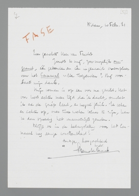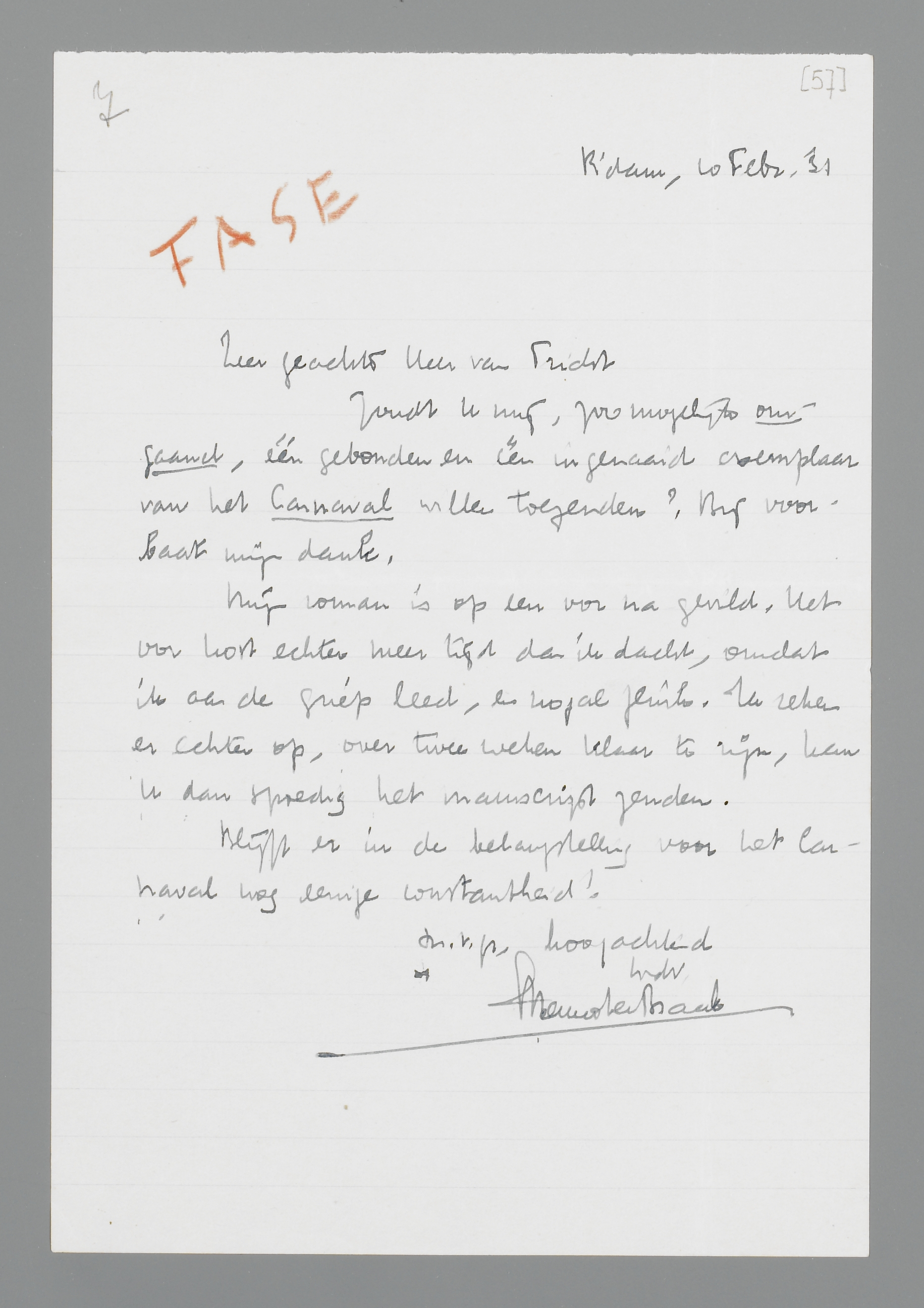 Zoudt U mij, zoo mogelijk omgaand, één gebonden en één ingenaaid exemplaar van het Carnaval willen toezenden? Bij voorbaat mijn dank.