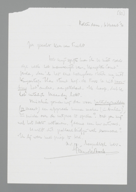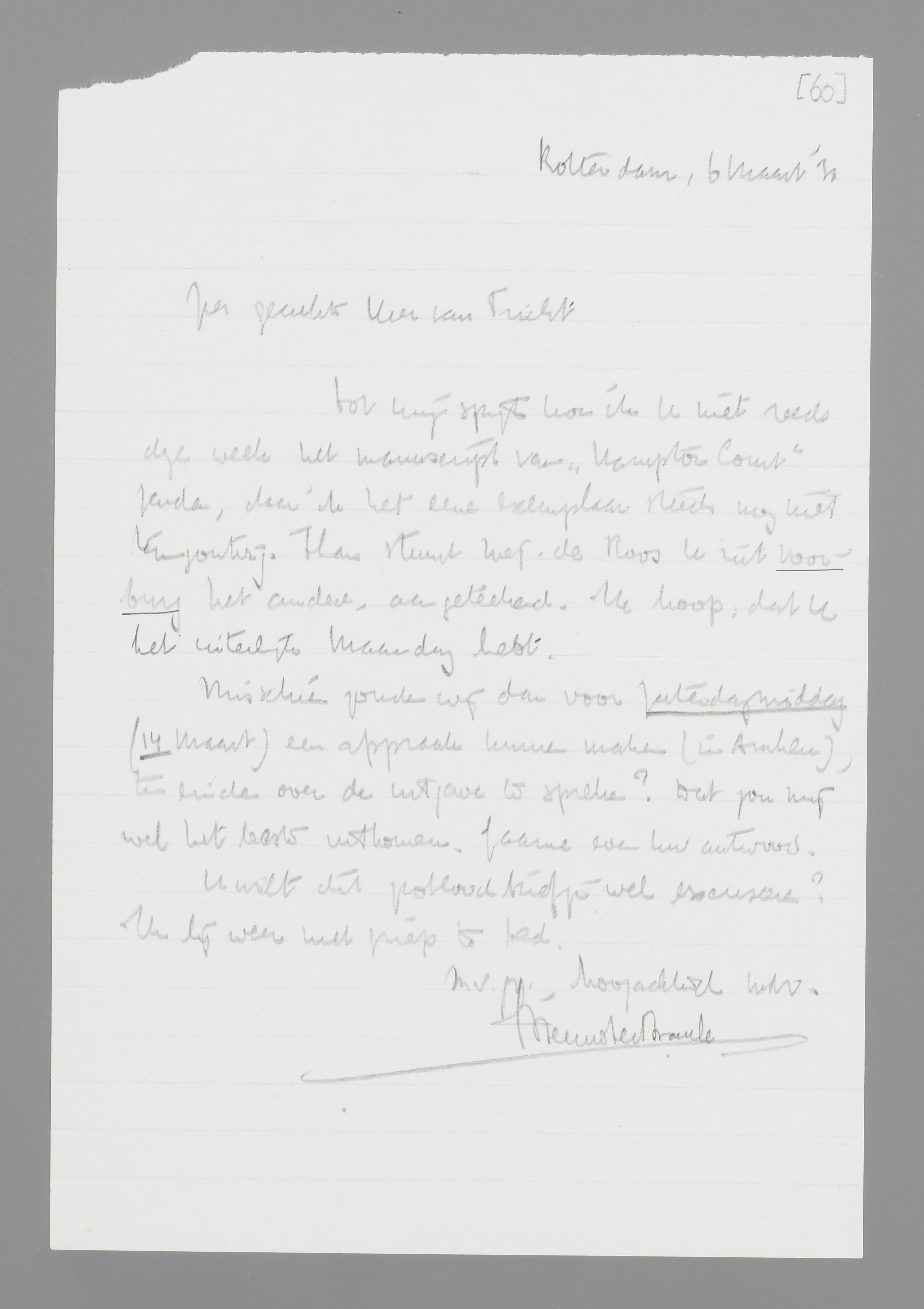 Tot mijn spijt kon ik U niet reeds deze week het manuscript van ‘Hampton Court’ zenden, daar ik het eene exemplaar steeds nog niet terugontving. Thans stuurt mej. de Roos U uit Voorburg het andere, aangeteekend. Ik hoop, dat U het uiterlijk Maandag hebt.