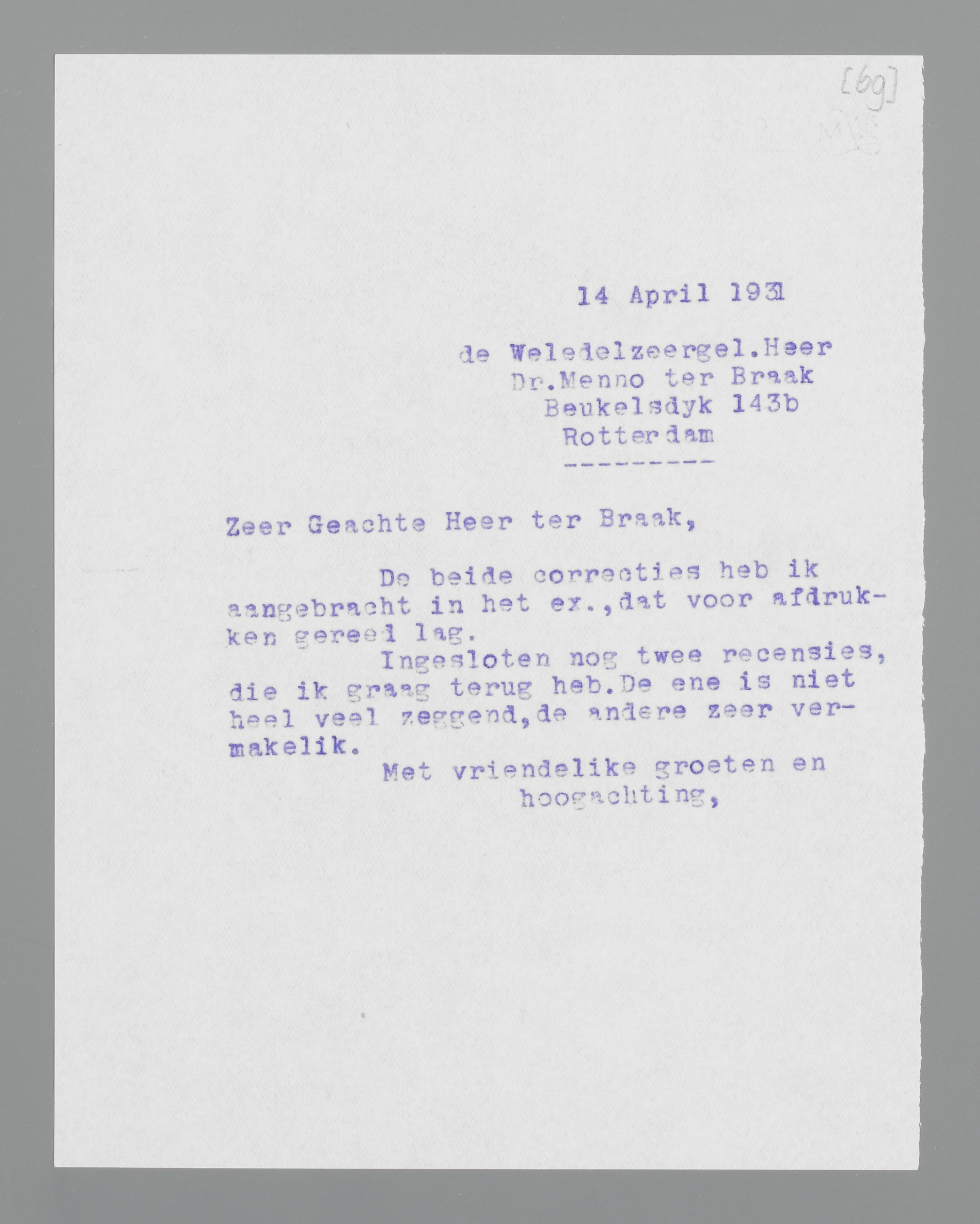 Zeer Geachte Heer ter Braak,